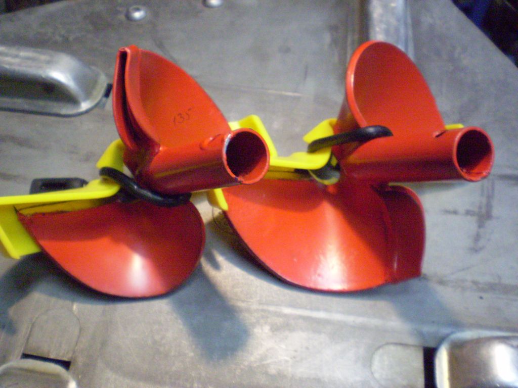 1. Темно-красная (скоростная), малиновая, бурмалиновая (цвет близок к коричневому, я не знаю почему фины так красят эти головки). За счет увеличенного угла атаки, за один оборот ножи снимают наибольшую толщину "стружки" льда. Диаметры: 100 и 115 мм. Обозначаются Sport.