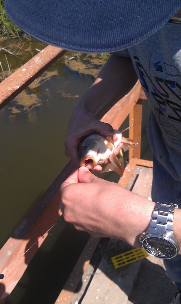 Ловили с дамбы, за 1,5 часа поймали 7 приличных карпиков. С 11 до 13 была одна нереализованная поклевка, все остальное поймали с 13 до 14-30, клев был постоянным, на каждом забросе, жаль крючки на плотву не давали реализовать все эти поклевки.