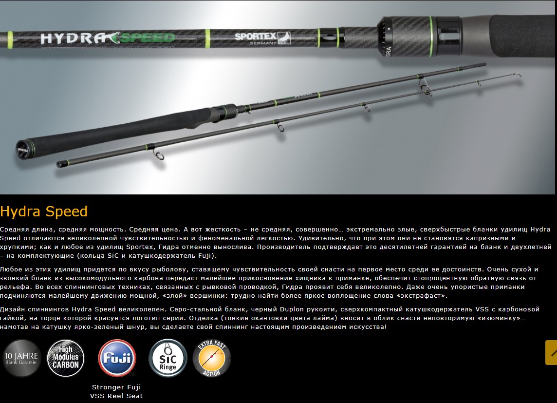 Средняя длина, средняя мощность. Средняя цена. А вот жесткость – не средняя, совершенно… экстремально злые, сверхбыстрые бланки удилищ Hydra Speed отличаются великолепной чувствительностью и феноменальной легкостью. Удивительно, что при этом они не становятся капризными и хрупкими; как и любое из удилищ Sportex, Гидра отменно вынослива. Производитель подтверждает это десятилетней гарантией на бланк и двухлетней – на комплектующие (кольца SiC и катушкодержатель Fuji). Любое из этих удилищ придется по вкусу рыболову, ставящему чувствительность своей снасти на первое место среди ее достоинств. Очень сухой и звонкий бланк из высокомодульного карбона передаст малейшее прикосновение хищника к приманке, обеспечит стопроцентную обратную связь от рельефа. Во всех спиннинговых техниках, связанных с рывковой проводкой, Гидра проявит себя великолепно. Даже очень упористые приманки подчиняются малейшему движению мощной, «злой» вершинки: трудно найти более яркое воплощение слова «экстрафаст». Дизайн спиннингов Hydra Speed великолепен. Серо-стальной бланк, черный Duplon рукояти, сверхкомпактный катушкодержатель VSS с карбоновой гайкой, на торце которой красуется логотип серии. Отделка (тонкие окантовки цвета лайма) вносит в облик снасти неповторимую «изюминку»… намотав на катушку ярко-зеленый шнур, вы сделаете свой спиннинг настоящим произведением искусства!