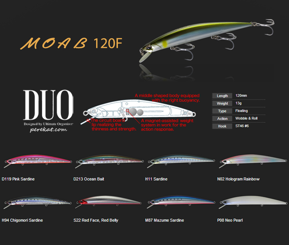 Воблеры DUO DUO – набирающие популярность японские воблеры. Именно Япония является на данный момент бесспорным лидером в Мире по производству высококлассных, высокотехнологических воблеров. Но, главное, что их уловистость высоко оценивают спиннингисты-практики. Помимо таких грандов, как Yo-zuri, Jackall, Smith, на наш рынок выходят и новые производители воблеров, давно известных в США и Японии. Воблеры DUO, как раз, одни из таких.Воблер DUO MOAB 120F. Еще один классный воблер Minnow от “Дуо”. Длина приманки 12см, а вес — 13г. Плавающий. Работает на глубинах до 1м. Отличный щучий твичинговый воблер для малых рек, отмелей. Прекрасно выманивает даже пассивную щуку, при проводке в прибрежной зоне, вдоль камышей, полос кувшинок, другой водной растительности. Приманка обладает хорошей дальностью полета, что редко встретишь среди минноу. Помимо ловли щуки вдоль водорослей, DUO MOAB показывает хорошие результаты при ночной рыбалке на отмелях, по судаку. http://www.youtube.com/watch?v=6mmxHroKbzA