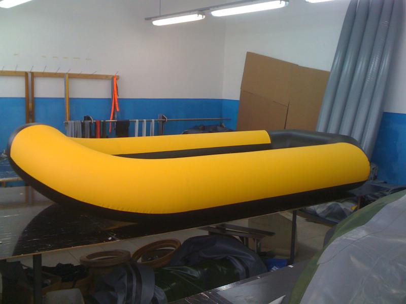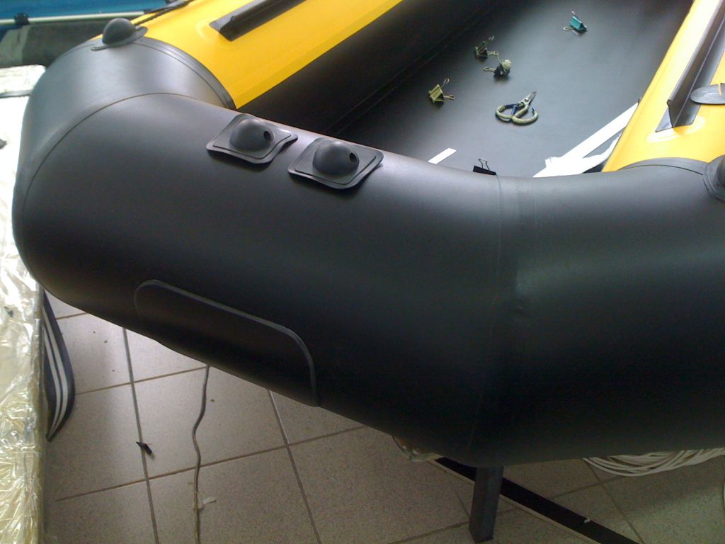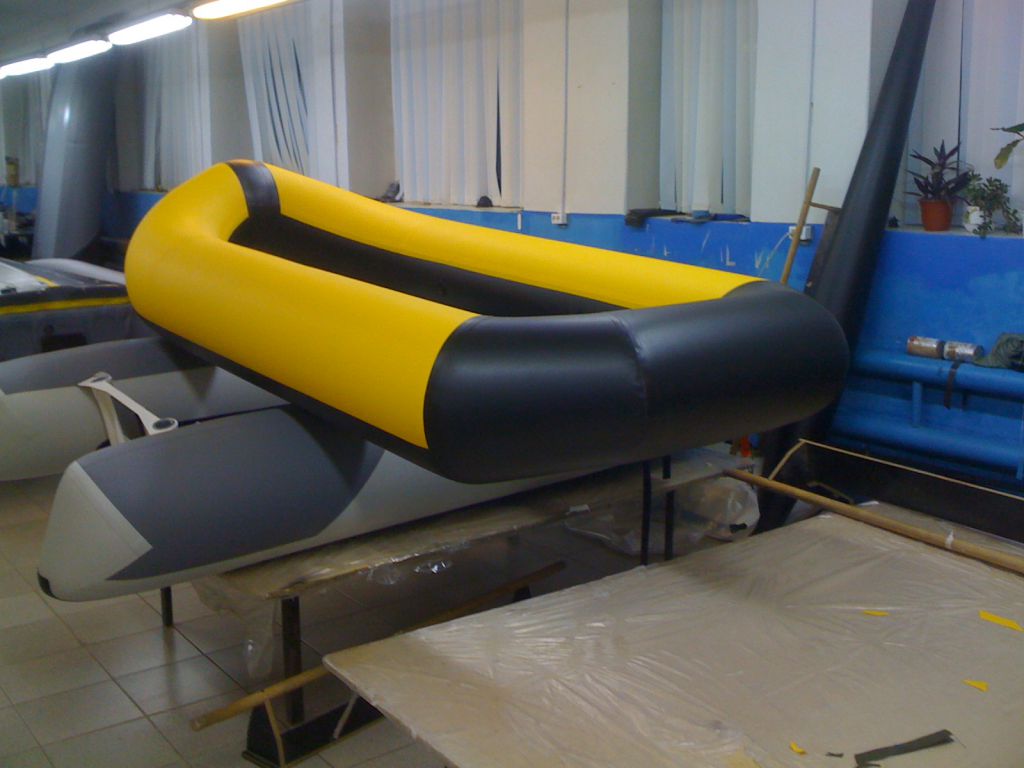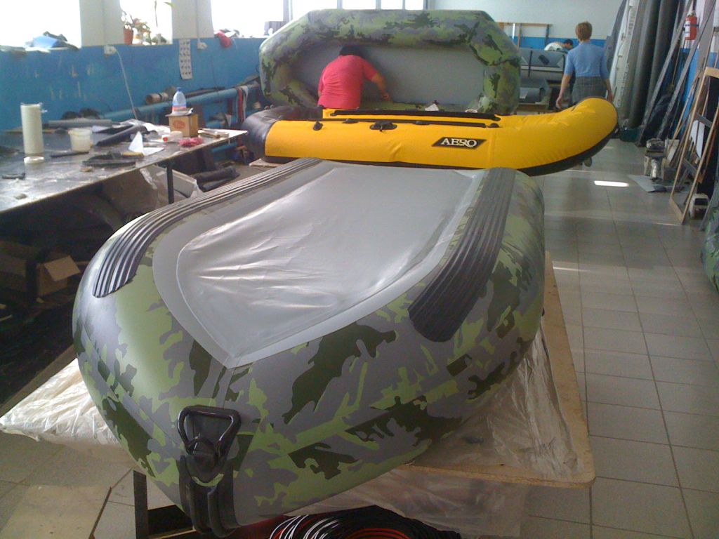 Лодку эту назвали АЭРО-300 СП (СпецПроект), она несерийная, единичный экземпляр, сделанный на заказ, потому на сайте АЭРО и нет про неё ничего. У них только 270-я лодка аналогичная есть, но она маловата, и баллон 37 см. Я-же попросил повыше закаячить нос, увеличить размер баллона до 40 см. (разумный минимум для моих условий), ширину лодки на 10 см., и длину на 30 см. Материал Финский "Виниплан", черный низ 900, желтый верх 750. Меньше тоже нельзя. Комплектацию сделали тоже по моему эскизу. Банки стеклопластиковые (легкие и прочные) на лик-тросах. Вес шкуры вышел 14,5 кг. (ровно как и моторчик в сумке). Полов заказал 2 разных- пайол/книжка и решетчатая слань, есть так-же подходящий по размеру аэрдек. НДНД не стал заказывать, т.к. вес шкурки увеличится и высота кокпита "сожрется", да и высокий ЦТ на такой малютке тоже не нужен. Кокпит у лодки 220 см. х 60 см., что соизмеримо с кокпитами, например, Флагмана-320 (220 см.), или Солар-330 (210 см.). Для одного места вполне достаточно. Крепление навесного транца сделано не как у других (где оно вминается в баллон), есть вклеенная опорная пластина. В пол-газа лодка вполне нормально едет, как и положено с мотовеслом! :D А на полный газ я и не собираюсь ездить. Да и смешно на микромоторчиках устраивать гонки, т.к. визжат они громче больших. :D Надо скорость больше, - надо садиться в другую лодку с бОльшим мотором. Вот немного фоток баллона с производства. И ещё одна штучная лодка для охотника.