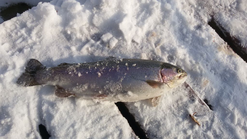 Форель прёт дурниной. Со льда ещё опасно, но с понтона нормально. За 5 минут поймал одну 870 грамм. И это после 2 часов механическая спиннингом с почти нулевым результатом.