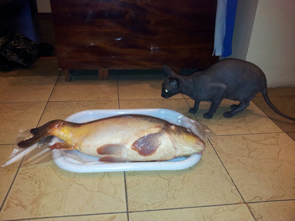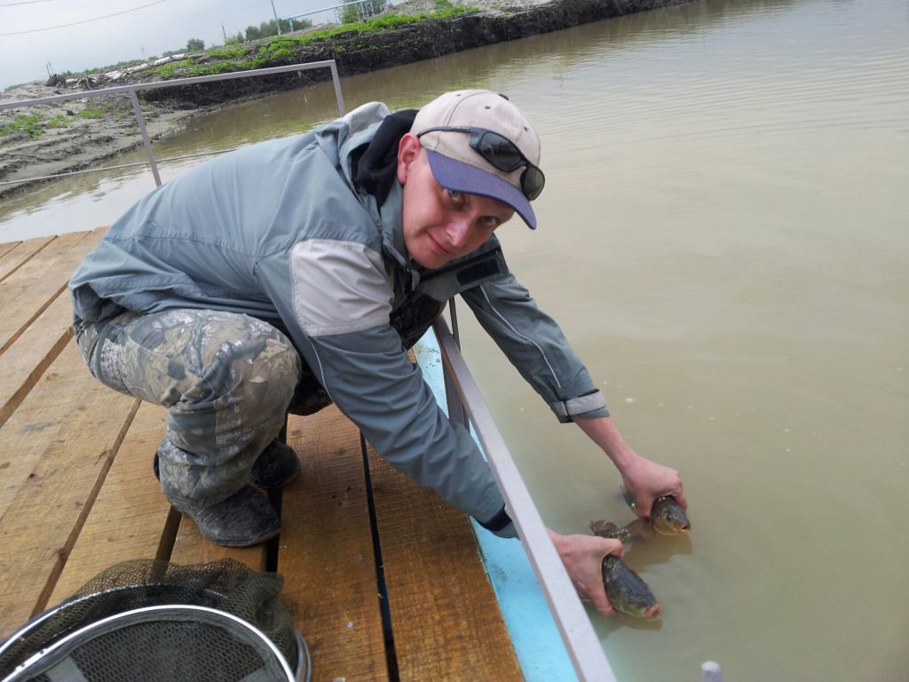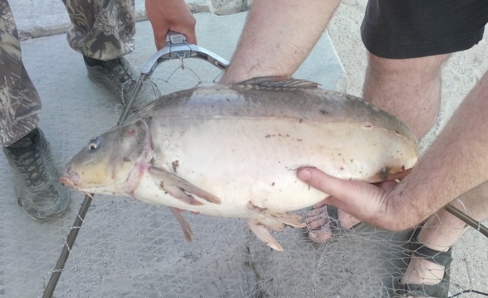 Заехал в субботу на 3 часа. Было жарковато, карпики клевали не очень охотно. Но под конец рыбалки повезло: вот такого поросенка на 4,8 кг удалось изловить на обычную поплавочку. Выводил его минут 20 на леске 0,2. Спасибо администратору-инструктору Сергею, помогшему с подсаком, и соседям-отдыхающим, помогшим запечатлеть улов.)