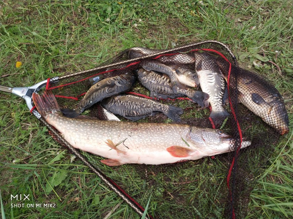 Результат: 3 щуки (1.8, 1.6, примерно 1.5), мелкого карася надергали вдоволь. Целью была именно щука и она присутствует в достаточном объеме. Одну забрали, двух обратно утопили.