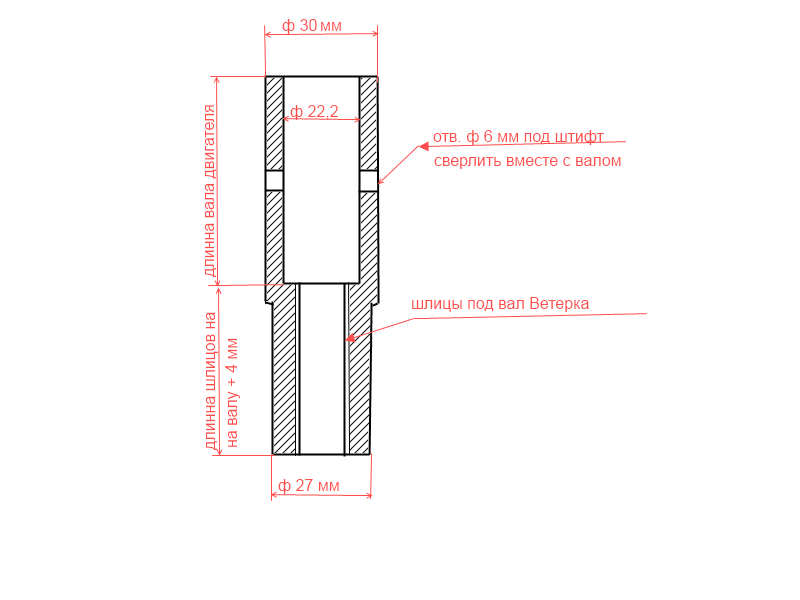 Вот примерно то что я сделал для своего движка. Штифт потому что не захотел заморачиваться со шпоночной канавкой, сделан из хвостовика сверла, от смещения его держит внутренняя обойма подшипника. Теперь о шлицах; Я просто отрезал шлицевую часть от старого коленвала ветерка и запресовал в переходник и обварил по торцу. Переход по наружному диаметру потому что больше 27и в ногу не впихнешь, мешает рычаг включения хода.