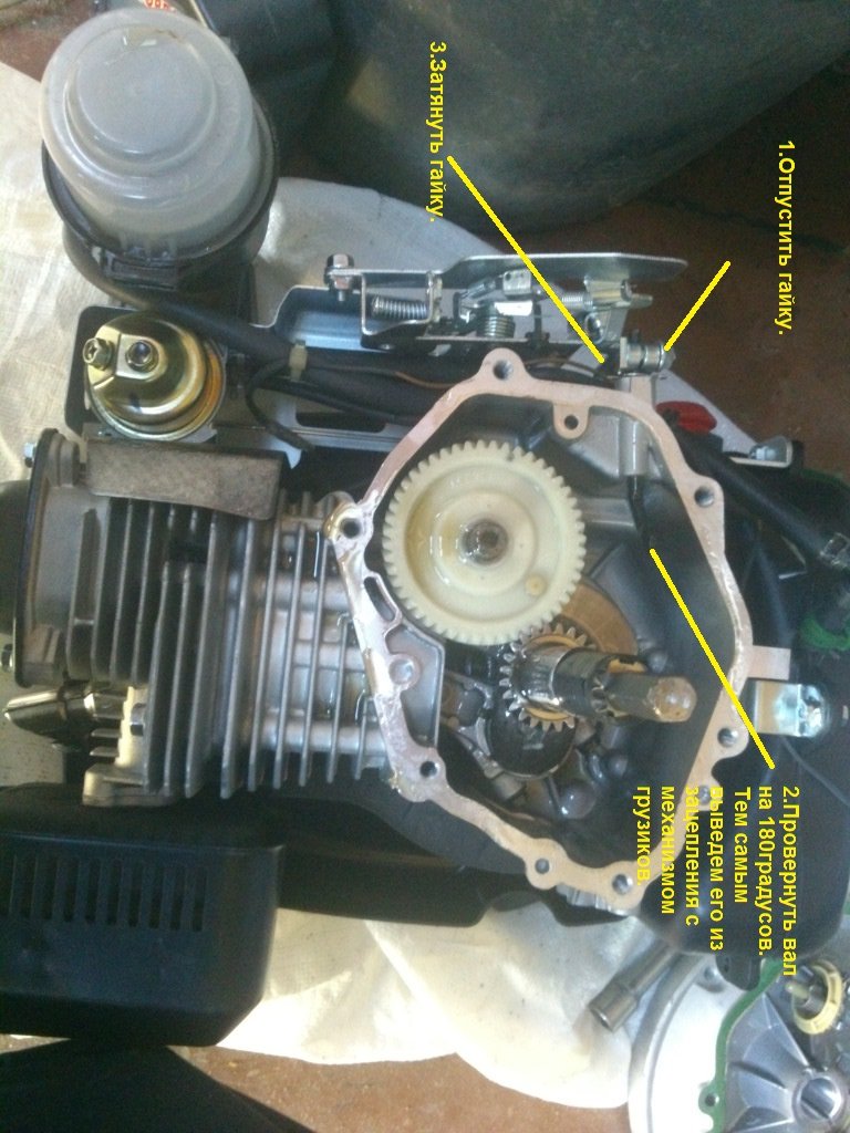 1.Ограничитель есть.Можно,конечно,просто отпустить гайку фиксации толкателя дроссельной заслонки на валу ограничителя.Но я сделал так:-Вскрыл картер,отпустил гайку на валу ограничителя и просто вал провернул на 180градусов, вывев из зацепления с механизмом ограничителя(демонтировать сам механизм ни в коем случае нельзя-на нем собран автомат-дэкомпрессор для облегчения запуска)