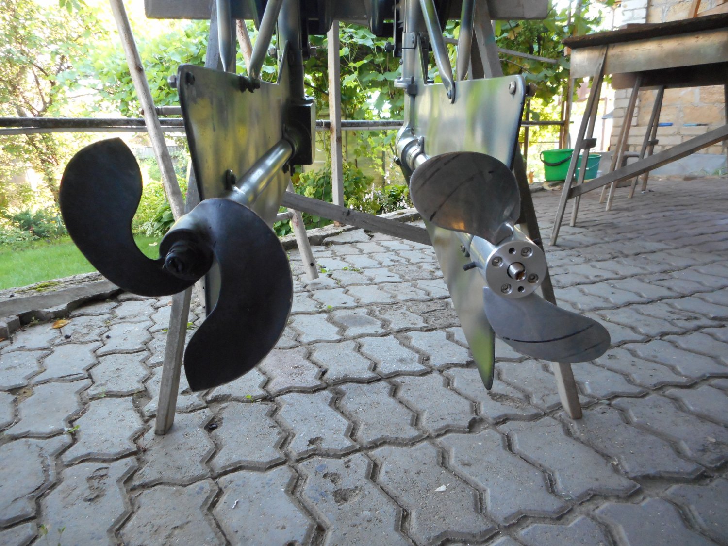 @serzay1, С винта собственно всё и началось... Долго морочился с подбором винта на болотоход с Ч-200, пока на глаза не попался винт изменяемого шага (ВИШ) от Вихря и куча запасных к нему лопастей.Но т.к. он был 3-х лопастной и большого диаметра(за счет массивной ступицы) было решено сделать к лопастям другую ступицу (см. фото) из Д16. Шаг менялся просто поворотом лопасти и фиксацией установочным винтом. Но встала другая проблема,- у него другое вращение, вот тут и пришлось делать макет ноги болотохода на московском редукторе т.к. у него есть реверс. Но здесь всё просто. Из куска дюраля 7мм. была сделана переходная пластина а на неё через фланец с подшипником ал. труба диам.35мм ну а дальше всё видно. Винт в итоге был подобран а нога вопреки всем ожиданиям и до сих пор используется по болотоходному назначению (правда не в экстремальных условиях)