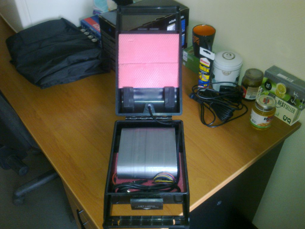 Собственно, вот фото того, ради чего всё и затевалось. Чтобы батарея не болталась внутри, обернули её туристическим ковриком. Для мягкости сам бокс оклеил изнутри тем же.