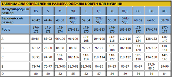 Размеры термобелья Norfin Winter Line можно определить по специальной таблице примерно прикинув на себе все необходимые размеры обозначенные на рисунке буквами от «А» до «Е». Размеры варьируются в диапазоне от «М» до «XXXL».4.jpg