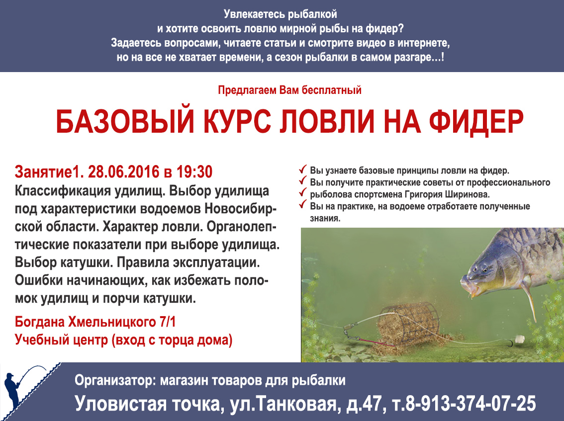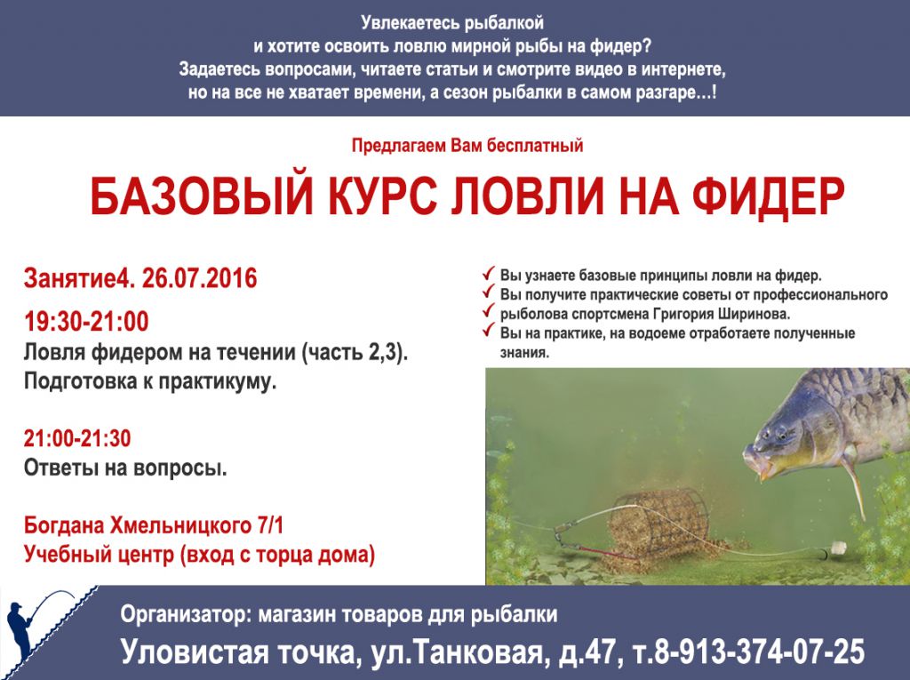 Курс ведет рыболов спортсмен Григорий Ширинов (стаж фидерной ловли 14 лет, участник Чемпионата мира 2011г). Курс бесплатный. Вход свободный. Так как магазин не может вместить всех желающих, занятия будут проходить в специализированном учебном классе по адресу Богдана Хмельницкого 7/1 (вход с торца дома, под лестницей, 5 минут пешком от магазина).