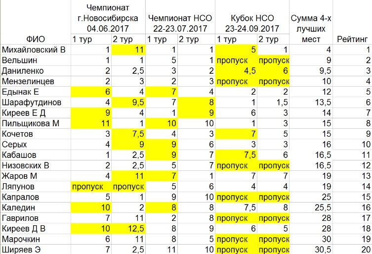 З.Ы. 3 место поделили Соловьев и Низовских но по баллам если не считать 2 худших у Соловьева они ниже и поэтому он 3-тий.