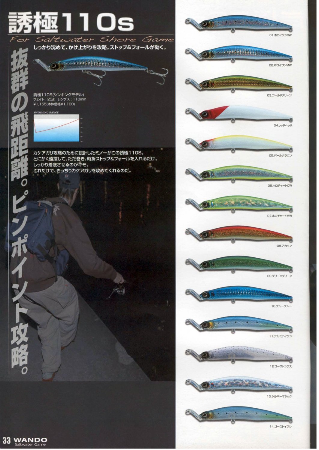Воблеры длинной 80 и 110 мм весят 28 и 25 г соответственно. По изначальной задумке японских инженеров, их нужно использовать для ловли на самых разных глубинах. После достижения воблером нужной глубины, при начале подмотки он будет стремиться вверх из-за нестандартного расположения лопасти.