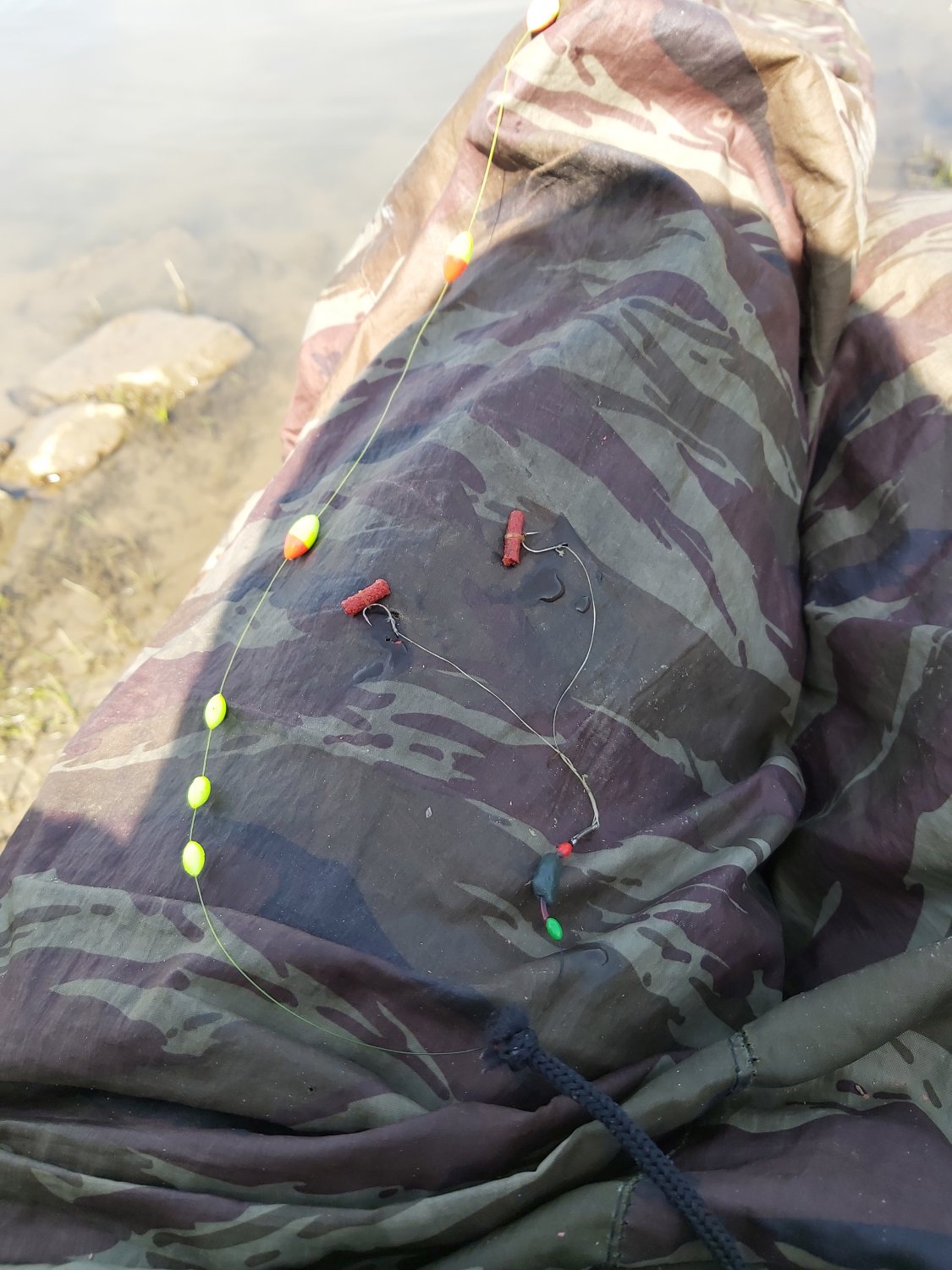 2. По снасти - длина не должна быть больше удилища, как это принято у поплавочки, т.к. заброс посложнее из-за гибкости удилища и возможны зацепы за берег или растительность на нем (Олег, спасибо). Для установки глубины (положения поплавка) удобно использовать стирательную резинку, в которую втыкается крючок.