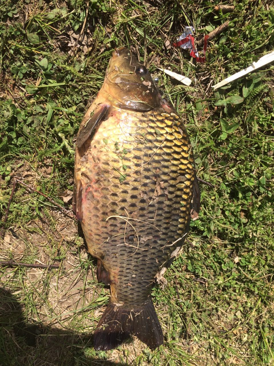 С лодки за камышами, глубина порядка 50 см выловили сазана ~1.5 кг