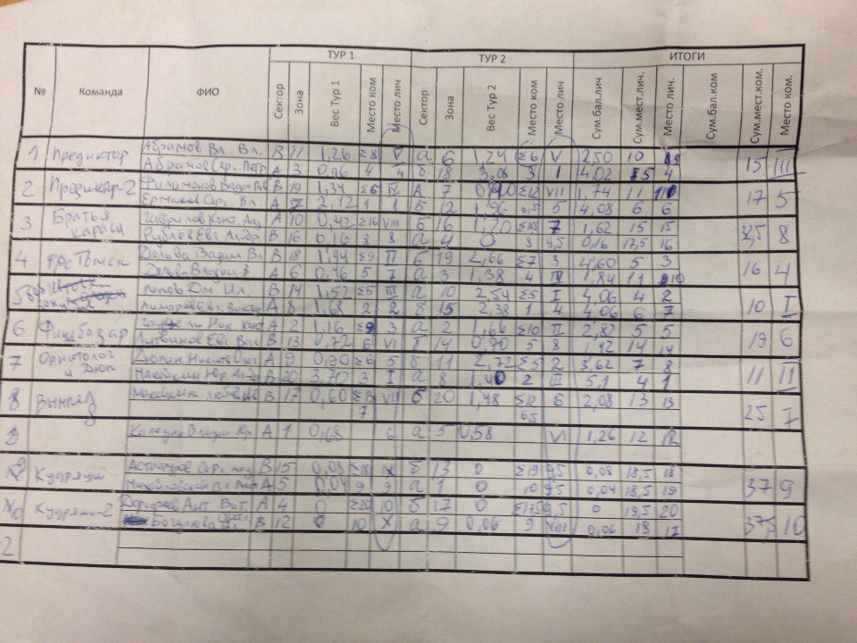 6.13. Подсчет результатов и определение победителей производится в соответствии с Правилами спортивного рыболовства от 20.03.2014г. Результаты спортсменов определяются путем взвешивания их уловов. Улов на взвешивание спортсменами предъявляется в чистом виде, без воды, и грунта. Взвешивание производится на весах с погрешностью не более 5 грамм. За предъявленную рыбу спортсмену начисляется по 1 баллу за каждый грамм веса. Победителем в туре признаётся спортсмен, имеющий наибольший вес улова (наибольшее количество баллов) и он занимает первое место в зоне. Остальные места распределяются в соответствии с количеством набранных баллов. За занятые места в туре спортсменам начисляются очки – занятому месту соответствует то же количество очков. Победители в соревновании определяются по наименьшему количеству очков(сумме мест), набранных в двух турах.