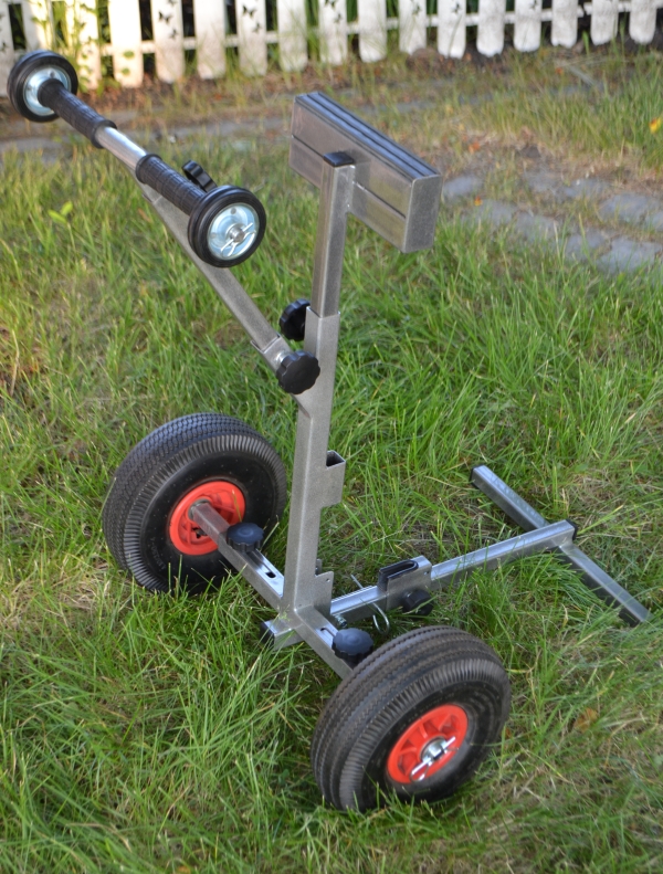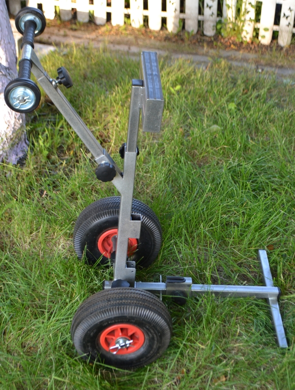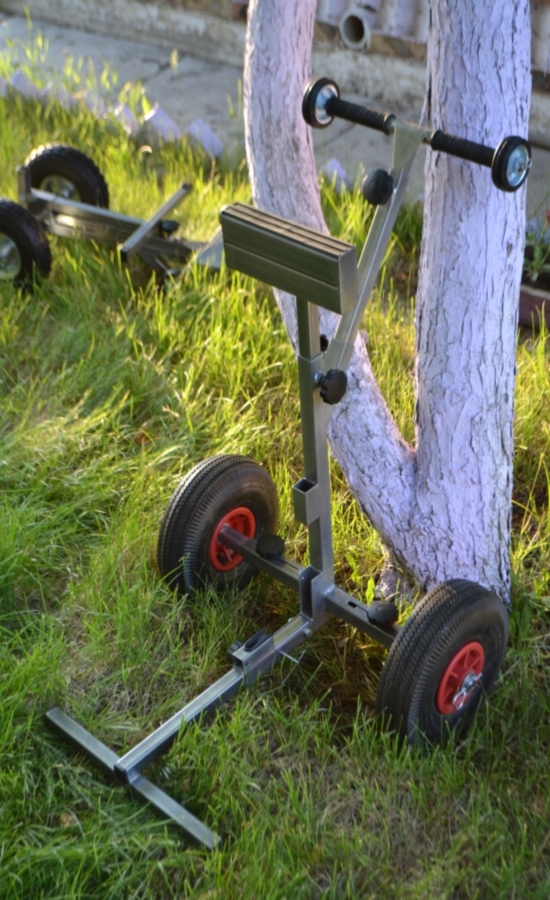 Имеется подвижная стойка,которую можно подобрать под высоту мотора.Ручка тележки может удлиняться для удобства перевозки мотора.На ручке тележки установлены дополнительные колеса для погрузки и выгрузки.