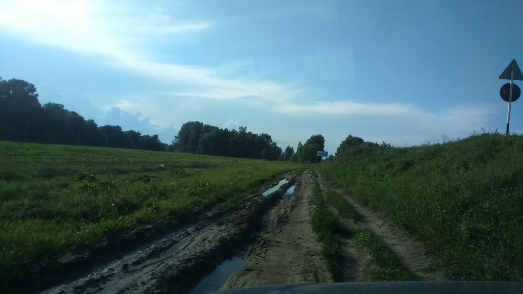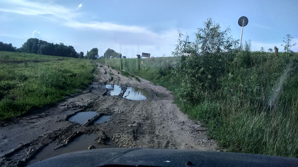 Съезжать лучше у баннера с колесами :) Съезд, что за остановкой - как-то не приглянулся мне, подразмыт и кусок обочины обвалился. Вдобавок, съехаве у баннера можно далее катиться 2 маршрутами: либо по "полю", либо по накатанной грунтовке. Грунтовка сырая и грязная, но абсолютно проезжая. Трава - гораздо суше и чище, с проездом также все ОК, как бы даже более такой пузотерочный вариант.