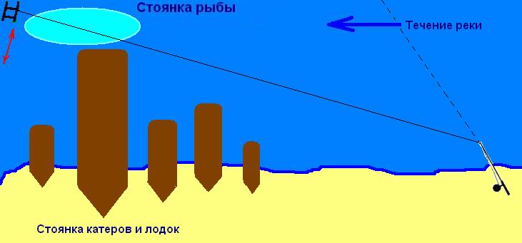 Или обловить участок за упавшим в воду большим деревом или допустим большими катерами и лодками стоящими на берегу, за кормой которых скапливается большое количество рыбы (проверено), если они долгое время неподвижно стоят на берегу см рис.