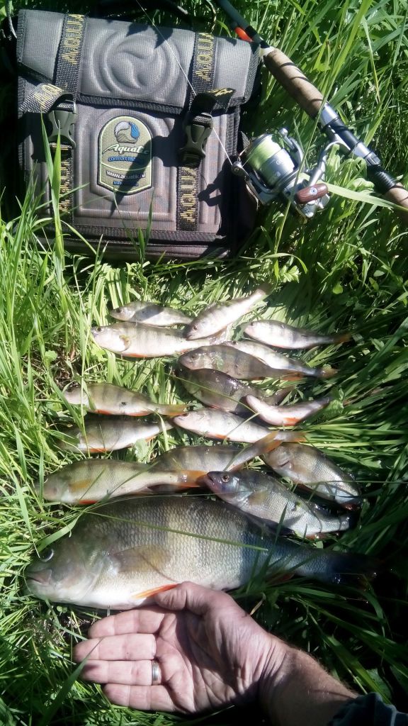 Итог утра: снова в пользу "берега", с лодки друг взял 4 окушка, я с берега 16 штук, 1 из них = 1200 гр., снасти те же. Третий друг на поплавок+червя с места стоянки взял за утро около 10 окушков.