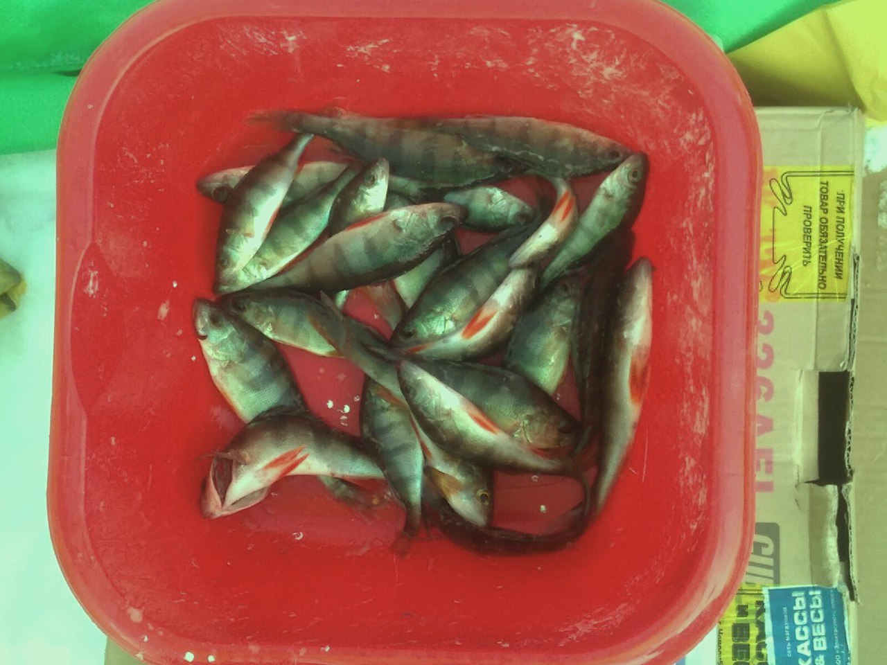 захожу в зону ближе к дальнему углу к небольшому мысу с камышами, старт, бурю две лунки у самого края, проверяю, воды подо льдом оказалось сантиметров 10-20 и трава, результат ноль. Делаю дорогу от этих лунок поперёк зоны к противоположному краю из 7-8 лунок, начинаю двигаться к середине, с каждой лунки вылавливал по 1 окуньку, мелкому, с одной удалось поднять аж 2 штуки. Прикорма на окуня нет, бегал в надежде ещё что-то поймать, но увы, рядом пробегал Николай Гауцель, посоветовал мне пересесть на плотву, на противоположном крае парни неплохо её полавливали, протянул время в ожидании 400 граммового окуня