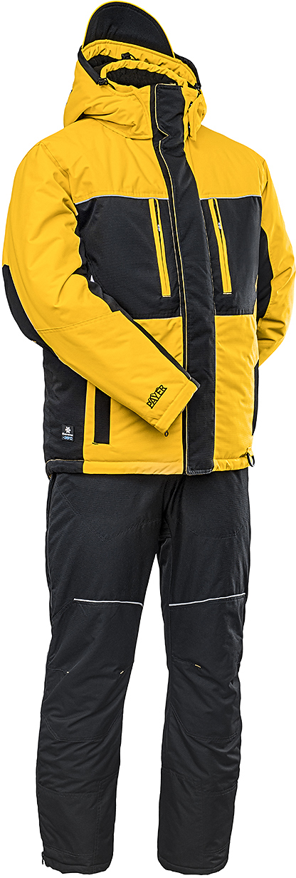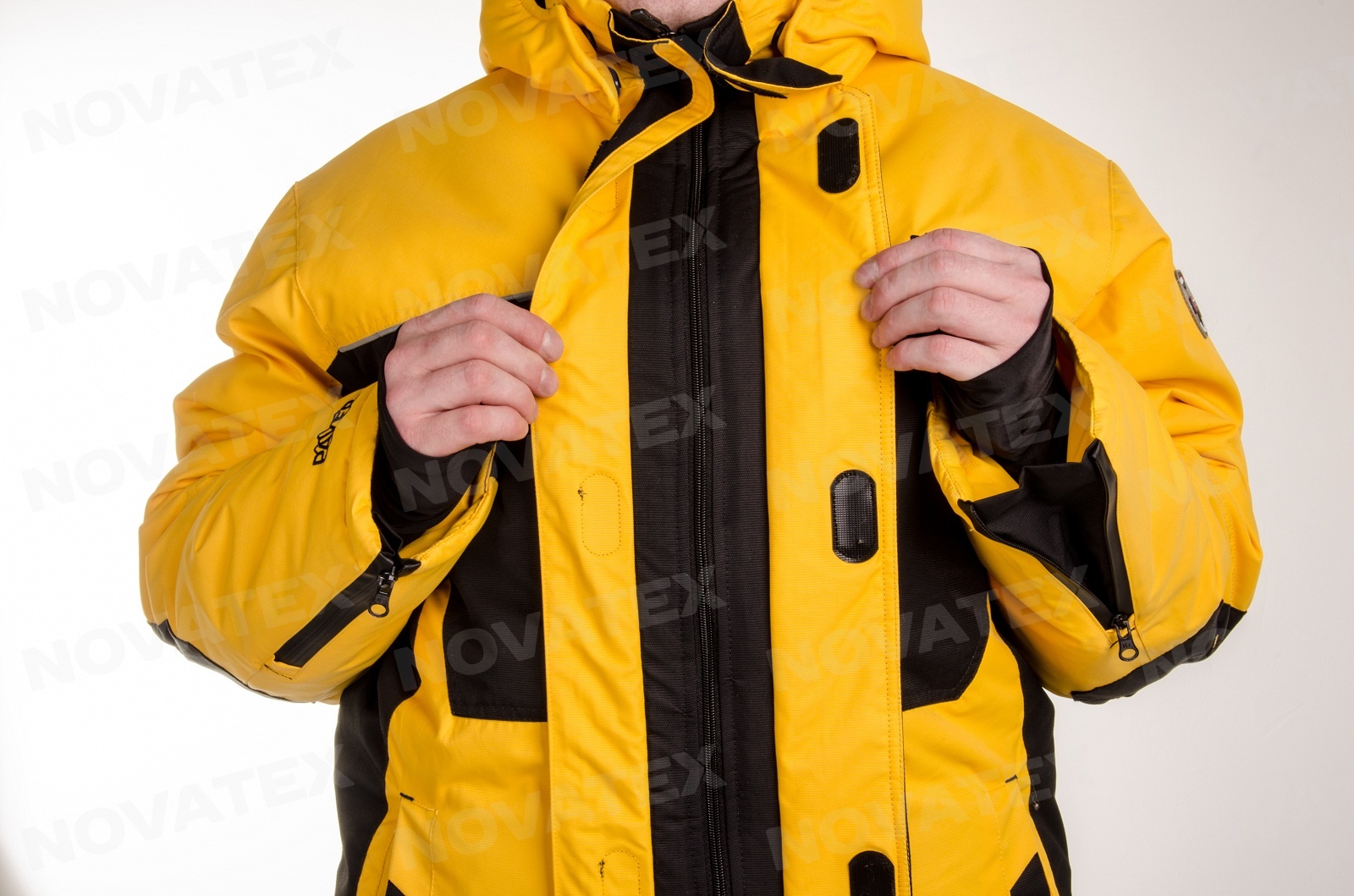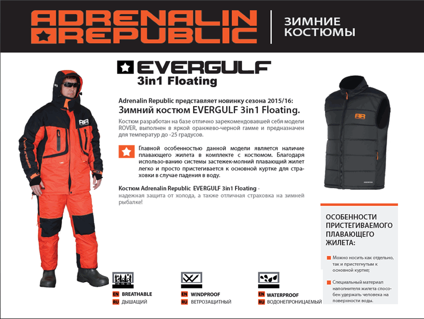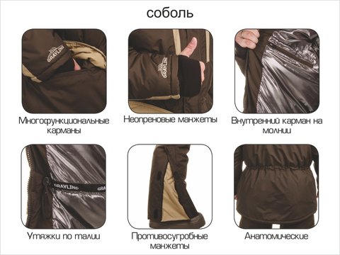 Съёмный регулируемый капюшон с козырьком спасет от дождя и снега. А от столь неприятного проникновения влаги под куртку рыболова спасут вшитые лайкровые манжеты и затяжки-«липучки» на рукавах. Коленная зона брюк имеет анатомический (повторяющий форму согнутых ног) крой и утеплена защитными, из пенополиэтилена, прокладками, которые не только уберегут от холода, но и смягчат удары при падении. Специальные клапаны и боковые молнии помогут надеть/снять штаны не снимая обуви.
