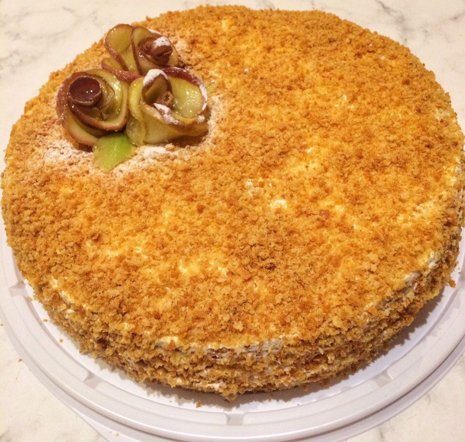 Торт "Медово- коньячный" украшенный розами из яблок.