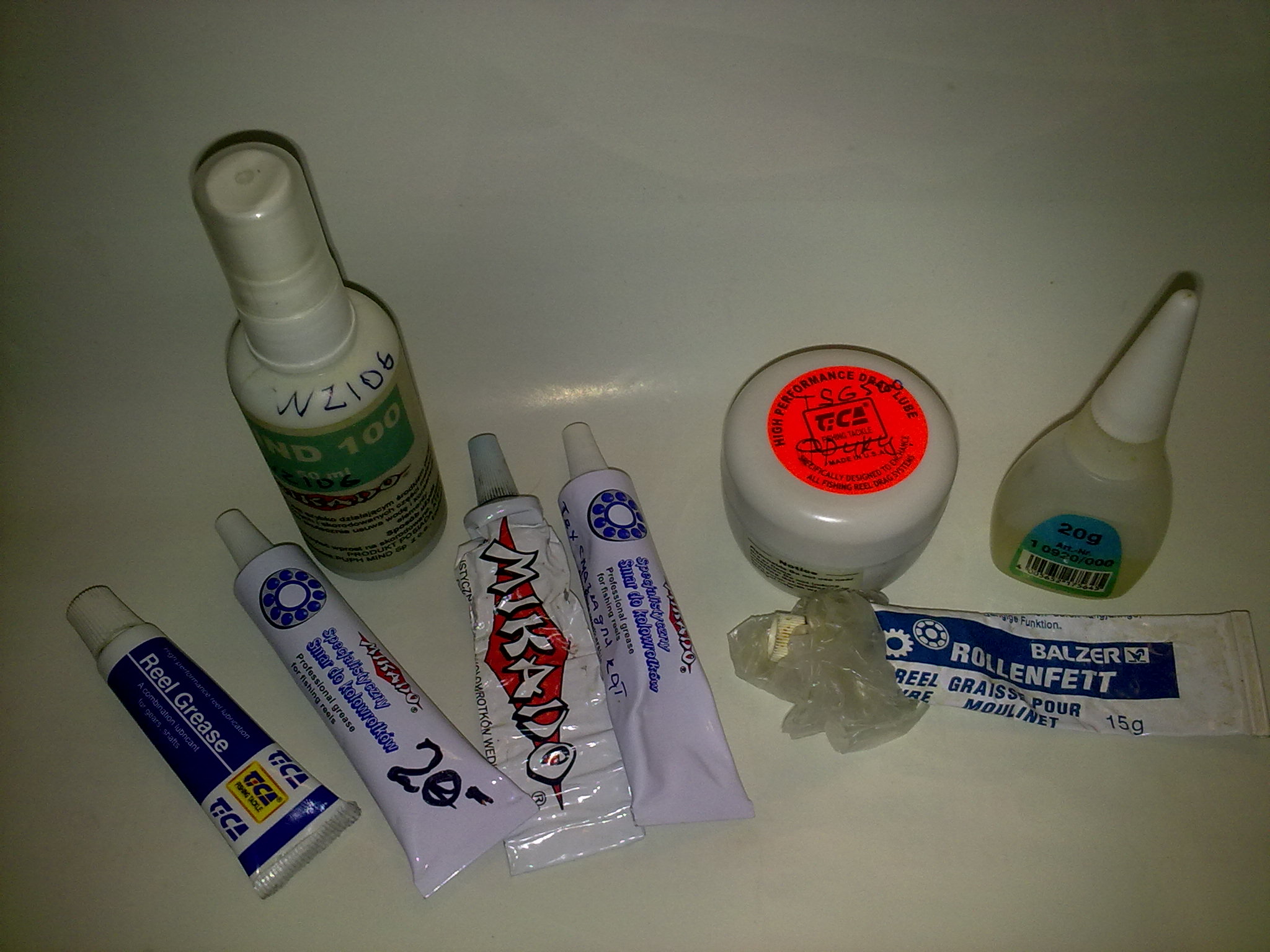 Из густых смазок, представленных на Вашей фотке пользовалься только Mikado. Причем теми, что в тюбиках, по центру. При этом про 2 одинаковые на фото, с нарисованными на тюбиках шарикоподшипниками с синими шариками ничего сказать не могу - мне она показалась слишком густой и слишком со слабой "прилипаемостью" (адгезией), поэтому от ее использования отказался (не знаю, правильно ли... возможно стоило и поэкспериментировать). За гриз в тюбике по центру, который синий, тянущийся (на тюбике название "фирмы" Mikado написано крупно, на фоне большого красного ромба), впечатления были весьма положительные. Очень тянущийся этот гриз. Гасит неприятные звуки работы механизма, в т.ч. и изношенных ШП. Все с этим гризом очень классно, за одним исключением: стоит немного попасть водичке - вспухает зверски и начинает клинить смазанные пары. Вследствие чего, мне приходилось открывать крышку катушки на рыбалке, сдувать капли воды и просушивать на "торпеде" под лобовым стеклом в а/м. Масла такого (как на фото) у меня не было, соответственно и не было экспериментов в смешивании. В общем случае сам факт смешивания гриза и масла в случае их химической совместимости (это когда смесь неделю - две постоит в прозрачной таре и не разделится на густую и жидкую фракции) приводит к снижению нижней границы температуры, при которой катушка работает еще не "туго" и снижению эффекта "вспухания" гриза при попадании воды. Исходя из этого, экспериментируйте, смешивая масло и гриз в разных пропорциях.