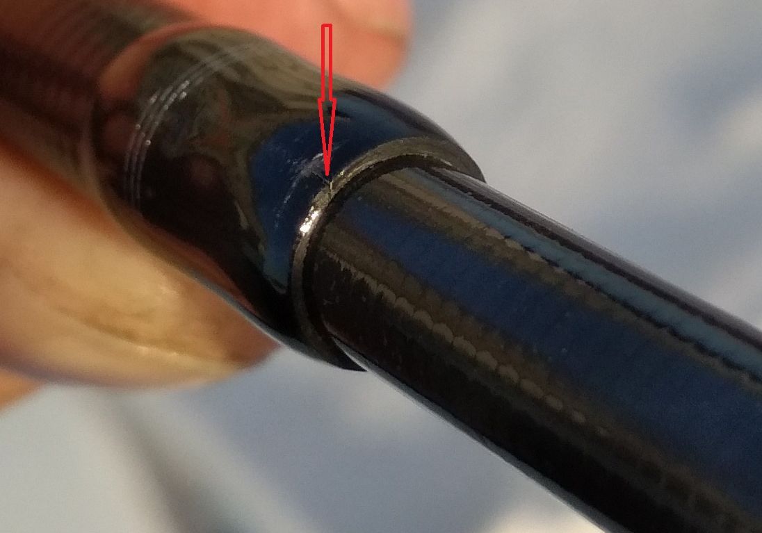 Николай777 сказал(а):Добрый вечер всем, пишу первый раз, но за форумом слежу уже давно. Вообщем столкнулся с такой проблемой,купил спиннинг в интернет-магазине, при осмотре обнаружил царапину(или трещину) на верхнем колене с внутренней стороны, с наружней стороны видна трещина лака, а может и самого бланка, несколько миллиметров( почти напротив внутренней царапины) Как вы считаете дефект ли это?( продавец вообще говорит ,что это просто шов)Прилагаю фото места дефекта.