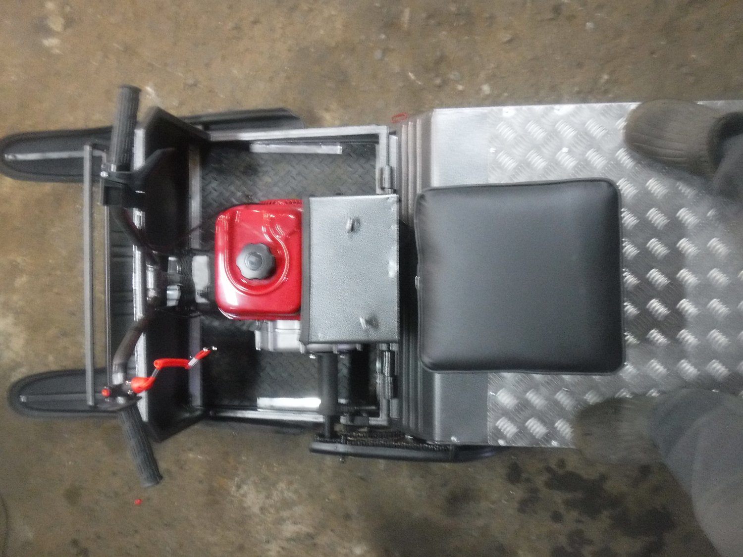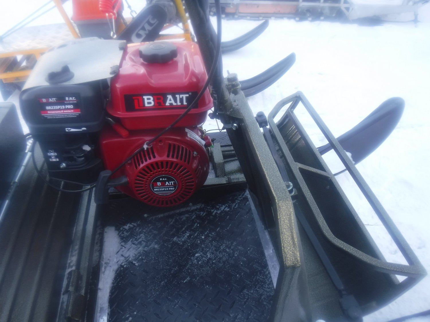 Первые шпионские фото Рыбака с центральным расположением движка. Аппарат на 50мм шире. Ширина полисклиза 635 мм. Передний блок длиннее на 80мм. Управляемые лыжи большей площади и измененного радиуса носка,что дает меньшее сопротивление. Посадка удобная.Теплый воздух подогревает снизу.Есть возможность вставать на одно колено,как левое,так и справа. Из недостатков :будем изменять переднюю часть.Плоский щиток будет убран. Завтра поставлю видео