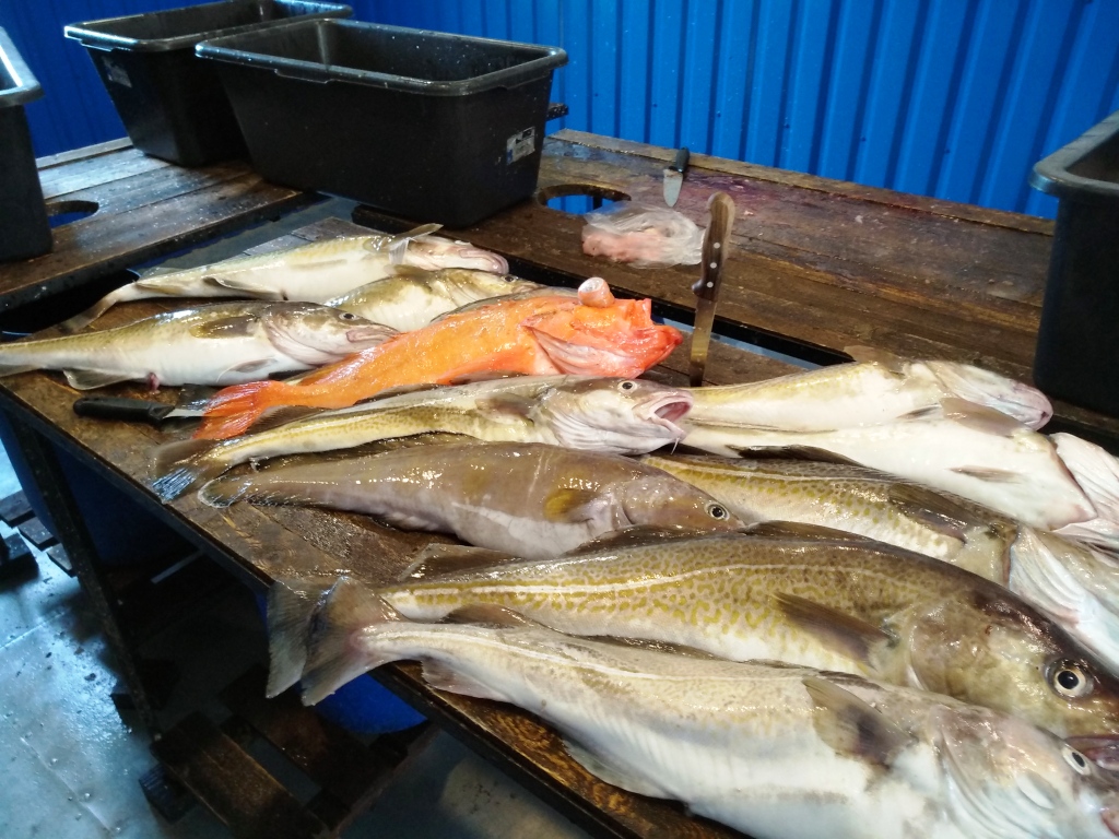 Сегодня была отличная рыбалка, достаточно много разнообразной рыбы - треска, пикша, морские окуня, налим и палтусенок. Глубина 180 метров. И погода, конечно же, великолепная - тепло и безветренно!