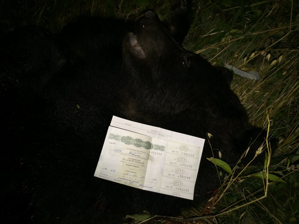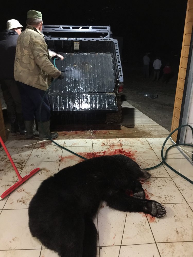 В результате охоты был добыт медведь весом около 150 кг, которого мы втроём с первого раза загрузили в кузов, положили туда же вещи и благополучно доставили трофей на базу для разделки.