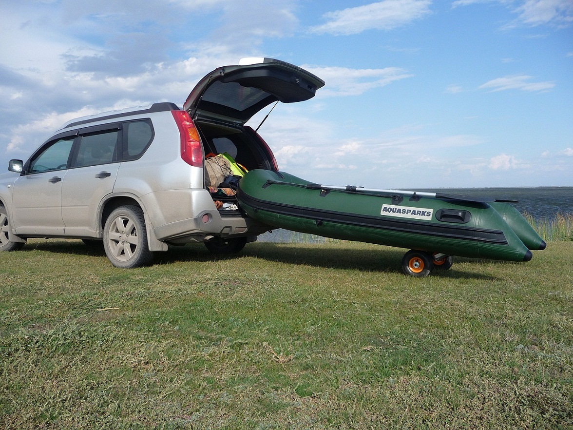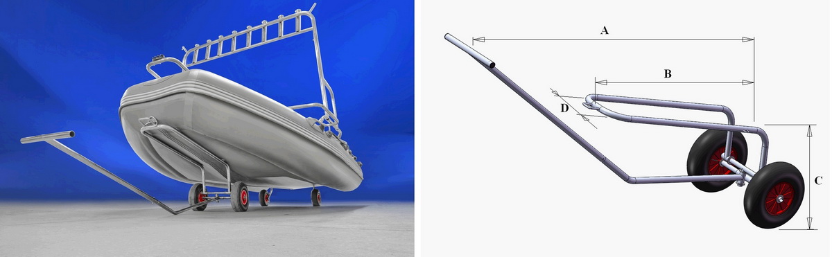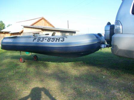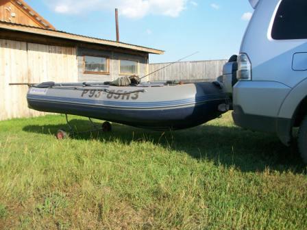 Недавно закончил приспособление для перевозки лодки на расстояние, превышающее перемещение от машины до уреза. Для этого достаточно просто транцевых колес. Существовала необходимость перемещения лодки на расстояние до 1 км со скоростью 10-15 км/ч. Первым этапом было изготовлено что-то вроде "специального лодочного фаркопа" со штатным крепежем на место запаски. Первый экземпляр потребовал переделки: лодка на поворотах царапала декоративную защиту запасного колеса. Пришлось нижнюю полку вынести на 200 мм. Последующие испытания со стандартными (переделанными под Флагман) транцевыми колесами выявили плохую устойчивость лодки при перемещении. Присутствие люфтов в каждом из колес (крепеже в т.ч.)приводило к тому, что каждое из них ехало по своему усмотрению. А из-за малого расстояния по колесной базе, лодка часто заваливалась на бок на поворотах и в небольшой проселочной колее. Пришла мысль сделать быстросъемный "не разрезной задний мост" на базе стандартных ТК с увеличенной колесной базой. В результате получился вот такой трансформер. Стойки ТК с горизонтальной осью крепятся с помощью: болт М8 + барашек. Конструкция из обычных ТК в транспортное состояние и обратно трансформируется в течении 2-3 мин. Сын разгонял данный автопоезд до 20 км/ч, больше ему не позволили. Тяжелых вещей в лодке и мотора на транце не перевожу, только для перемещения накачанной лодки и легкого шмурдяка в ней. Думаю, что километра 2-3 пройдет без проблем. Как-то так.