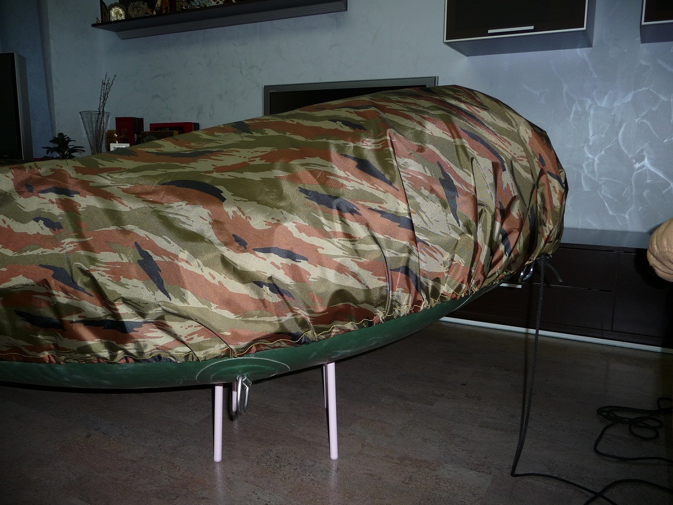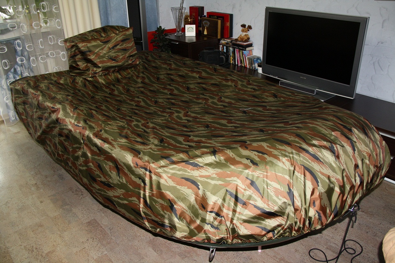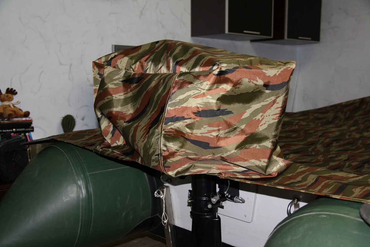 Озадачился приобретением стояночного тента на лодку, поиск по магазинам результата не дал, нашел только в Адреналине, но не мой размер. Пришлось привлекать к процессу жену со швейной машинкой. Два вечера мучений и вот что получилось... :roll: