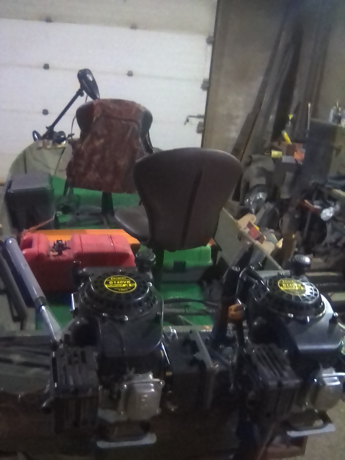 Теперь как и обещал, отвечу Вам. Как я уже писал по обмелевшей реке очень тяжело ходить, по этому принял решение поставить два маленьких мотора вместо одного большого, тем самым уменьшить глубину погружения http://www.wherry.ru/801-ustanovka-motora-na-lodku.php да и с другой стороны есть плюс два мотора в раз не откажут. Мотры соединены тягой, управление газом выведено на один румпель. Для того чтоб установить два мотора пришлось обрезать выносной транец Автобота и установить транцевую плиту во всю корму. Транцевая плита вырезана так чтоб была возможность установки как двух так и одного мотора. Моторы как Вы заметили гибриды 4-х тактные экономичные, с возможностью работы как от штатных бензобаков так и от выносного. Моторы имеют генераторы 7А, 84Вт для подзарядки АКБ от которого питается электромотор используемый для подруливания. Очень удобно держать лодку при рыбалке спиннингом. Да и если происходит зацеп направляешь лодку в сторону зацепа (не надо черепать веслами), спрокойно сматываешь спиннинг и снимаешь блесну.