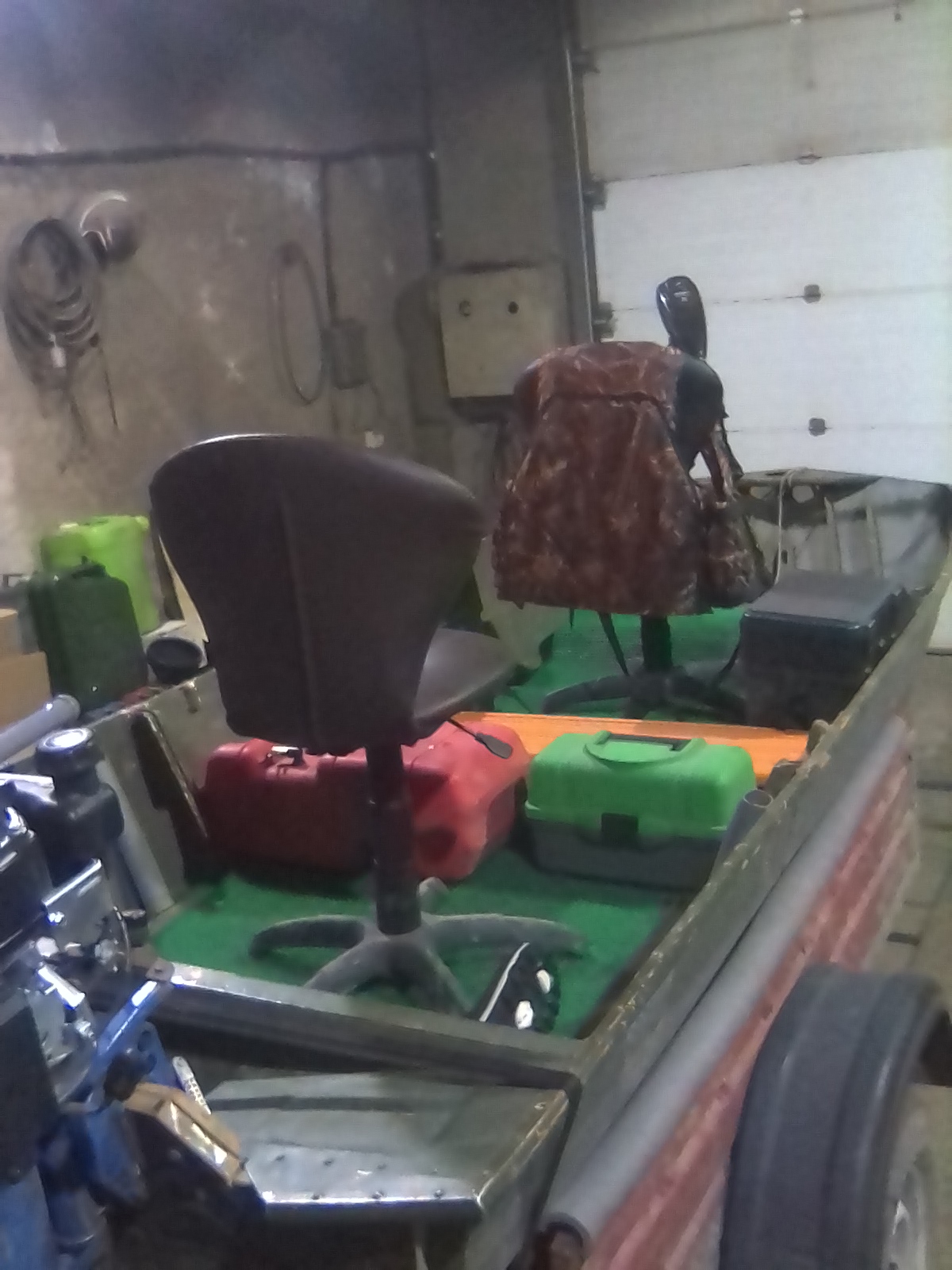 От низких неудобных седушек, которые являются еще и блоками плавучести отказался. Сделал из алюминиевых уголков каркас, приклепал алюминиевый лист вырезанный по размеру, кромки окантовал уплотнителем багажника от жигулей, на клипсы посадил пластиковое ковровое покрытие и получился прекрасный, не скользящий пол. Между полом и дном лодки уложены 1,5 литровые пластиковые бутылки в качестве блоков плавучести. Укомплектовал лодку раскладными 3-х коленными алюминиевыми веслами (вместо тяжелых деревянных-штатных), раскладным алюминиевым шестом, одну штатную сидушку обрезал вытащил пенопласт и получился съемный рундучек для инструмента, запасных винтов, дождевичка, ну и так по мелочи.