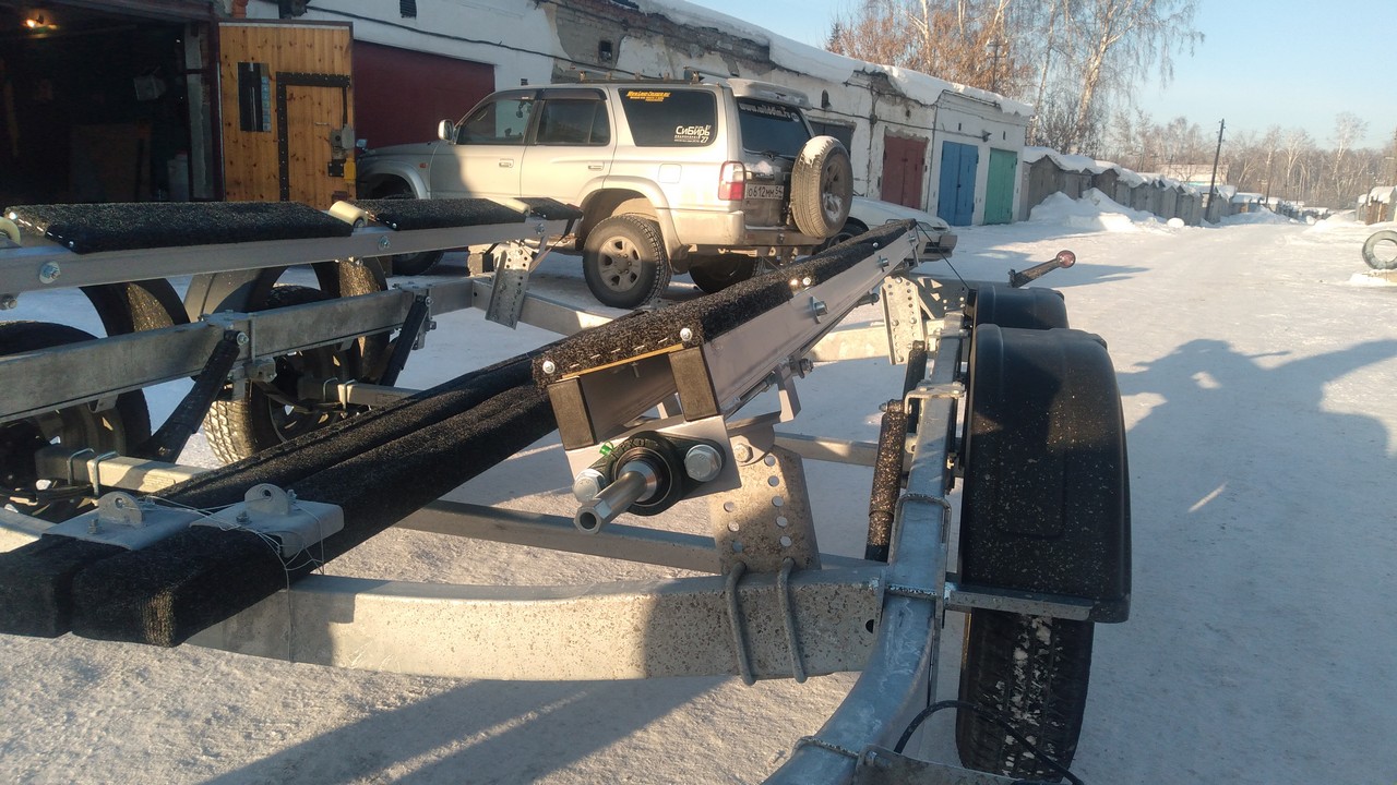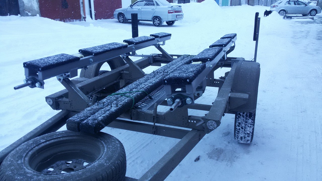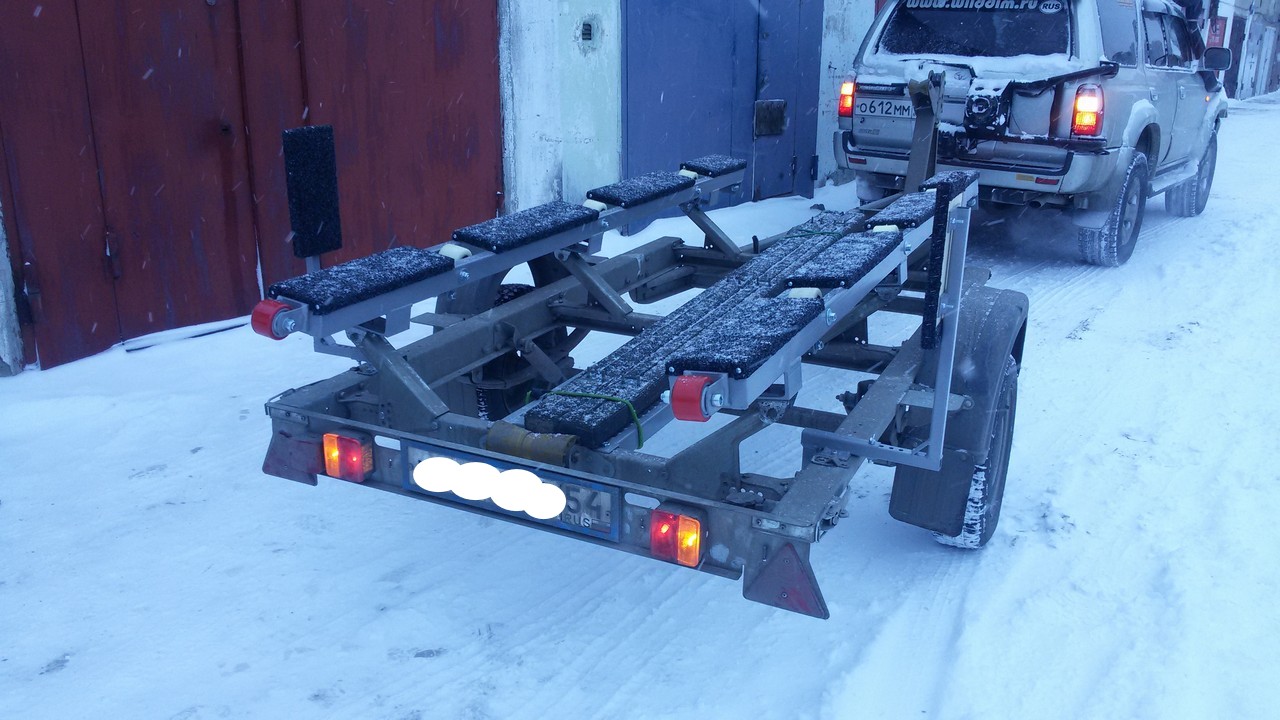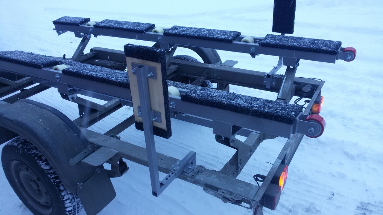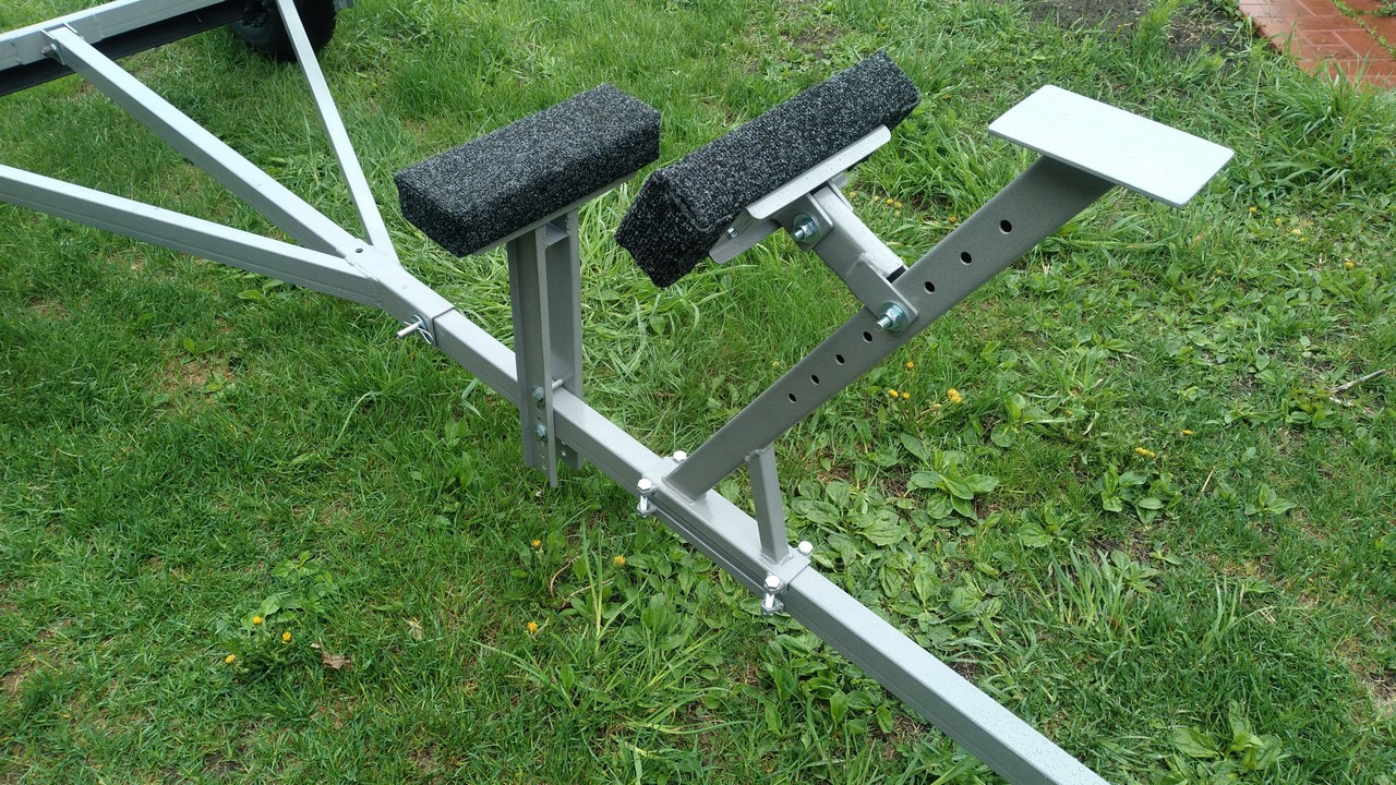Носовой упор передвижной, с лебедкой, рассчитан под лодку ПВХ. Передвижной подрамник на рессорах с отбойниками, позволяет проводить центровку прицепа под конкретную развесовку лодки и мотора. Передвижные скобы крепления лодки. Ложементы деревянные под ковролином. Страховочные цепи.