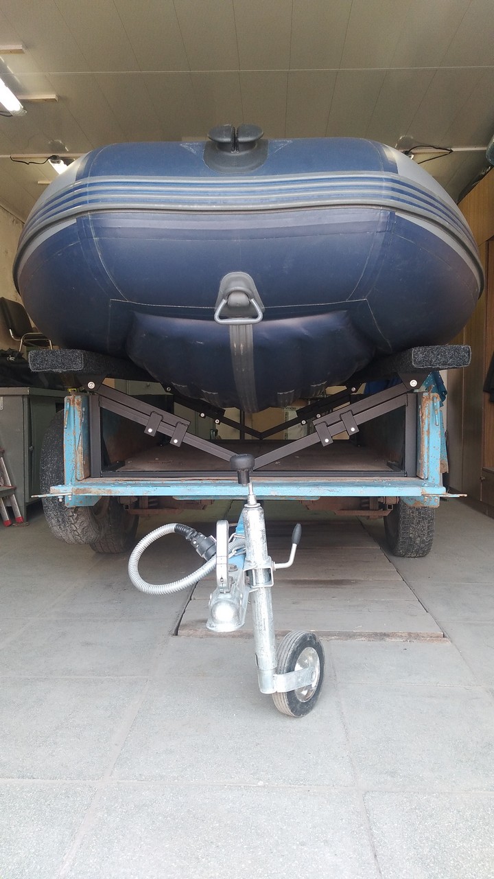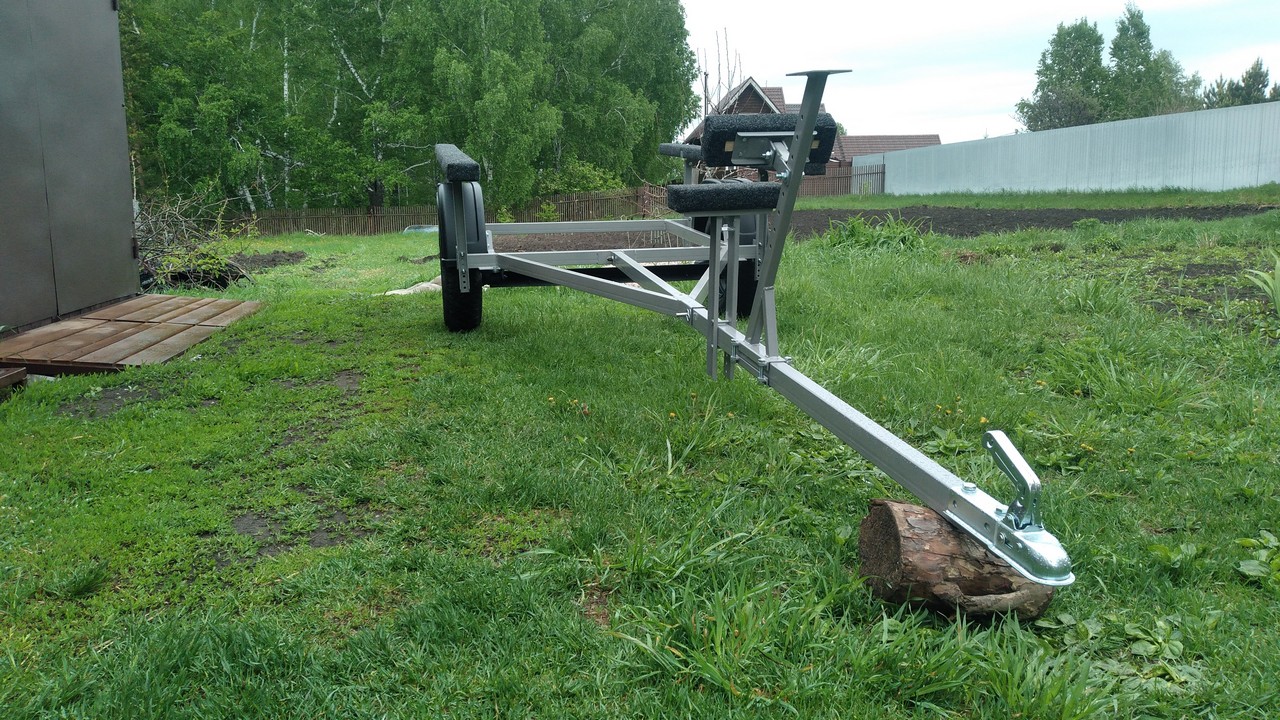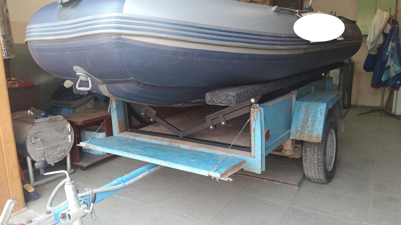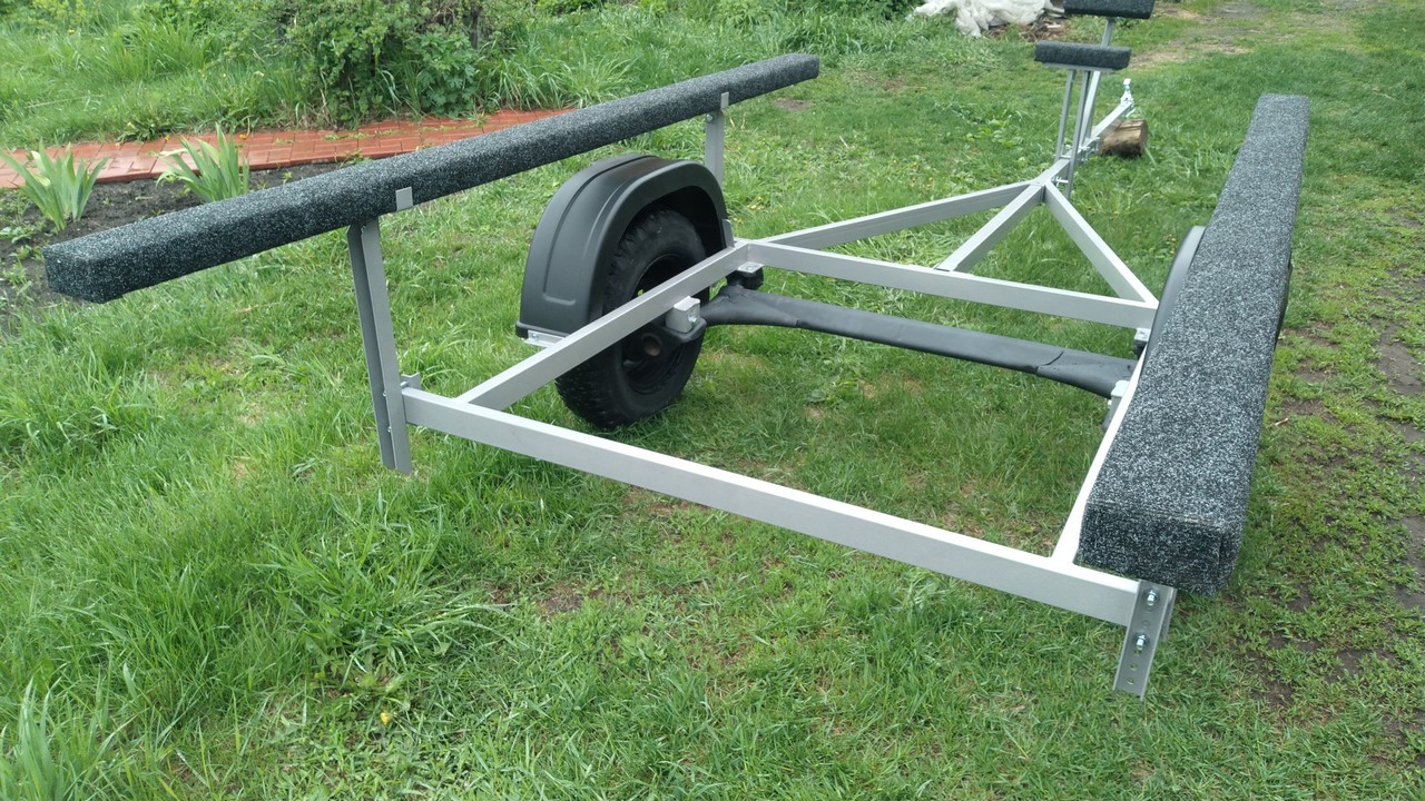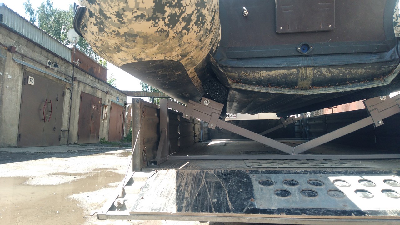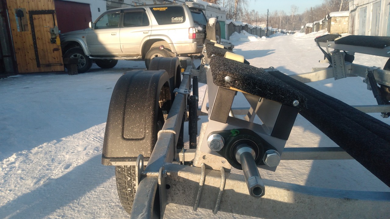 Носовой упор передвижной, с лебедкой, рассчитан под лодку ПВХ. Передвижной подрамник на рессорах с отбойниками, позволяет проводить центровку прицепа под конкретную развесовку лодки и мотора. Передвижные скобы крепления лодки. Ложементы деревянные под ковролином. Страховочные цепи.