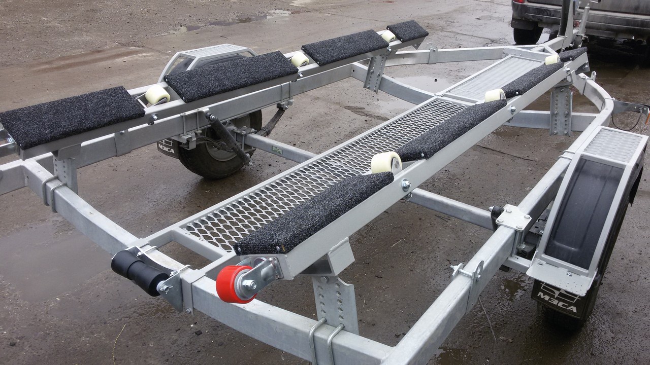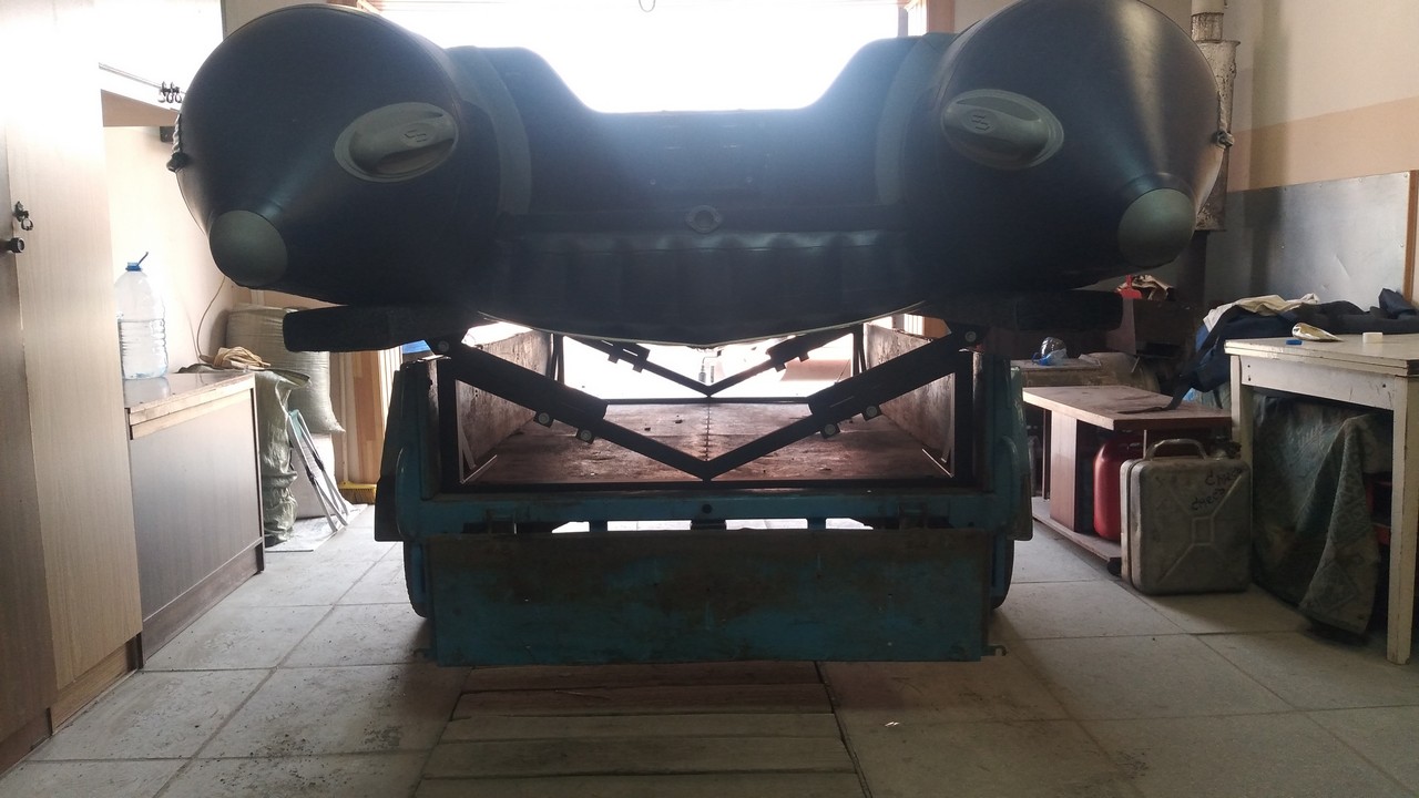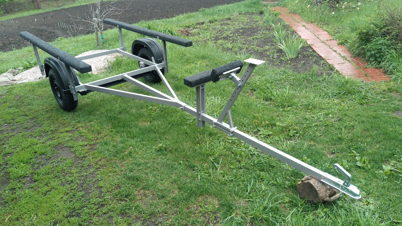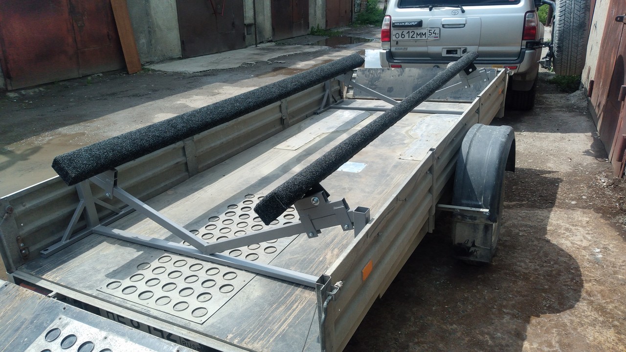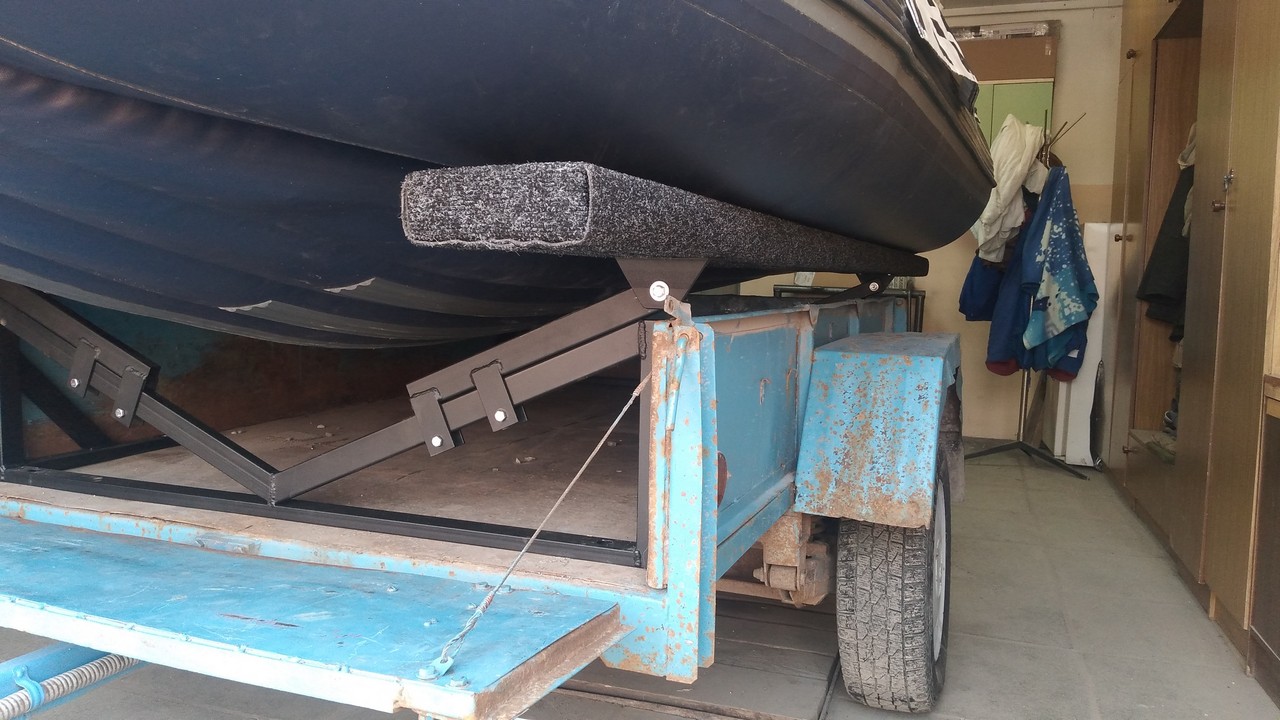 Носовой упор передвижной, с лебедкой, рассчитан под лодку ПВХ. Передвижной подрамник на рессорах с отбойниками, позволяет проводить центровку прицепа под конкретную развесовку лодки и мотора. Передвижные скобы крепления лодки. Ложементы деревянные под ковролином. Страховочные цепи.