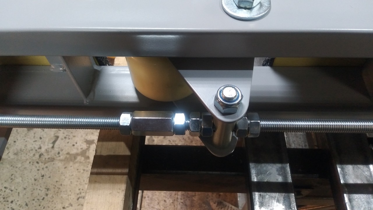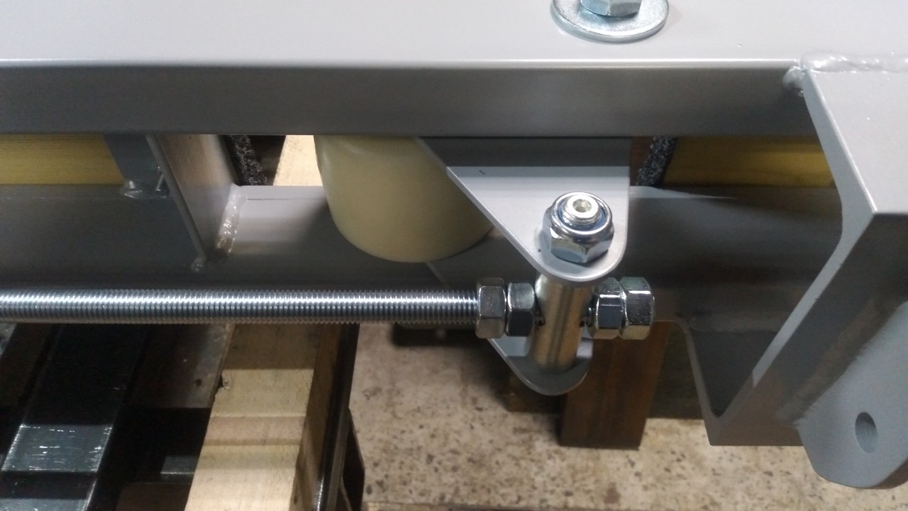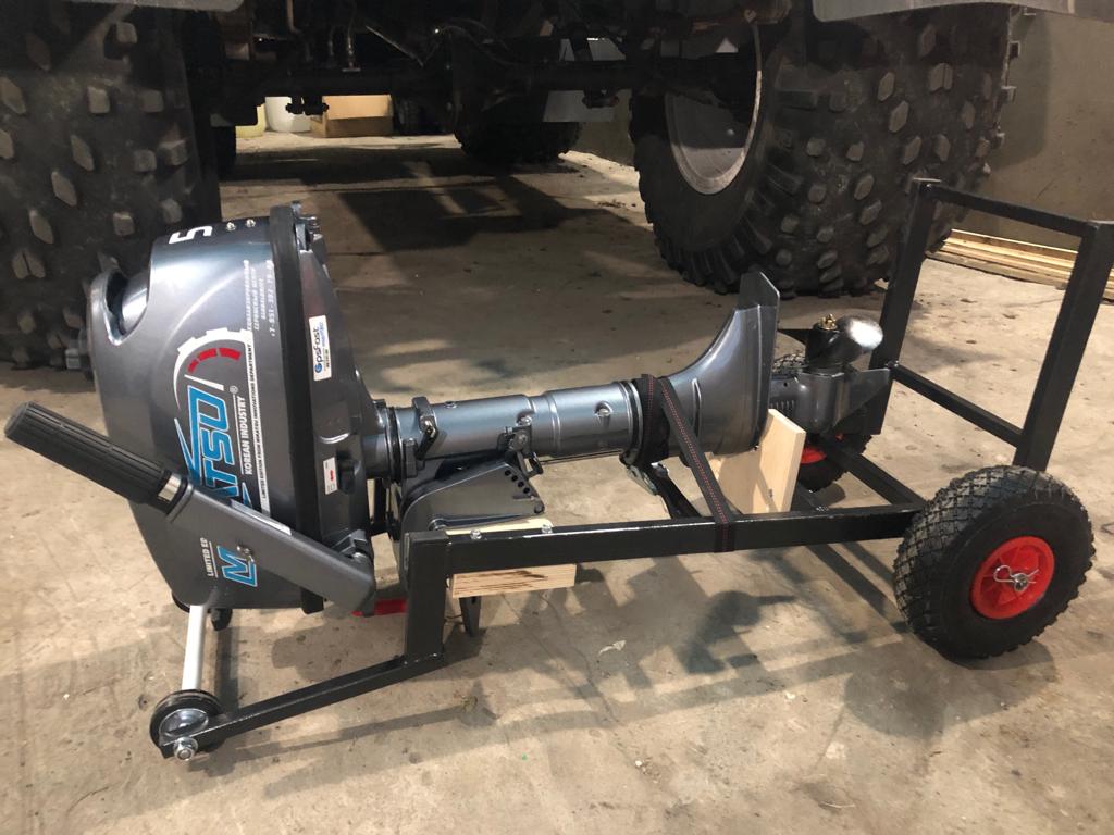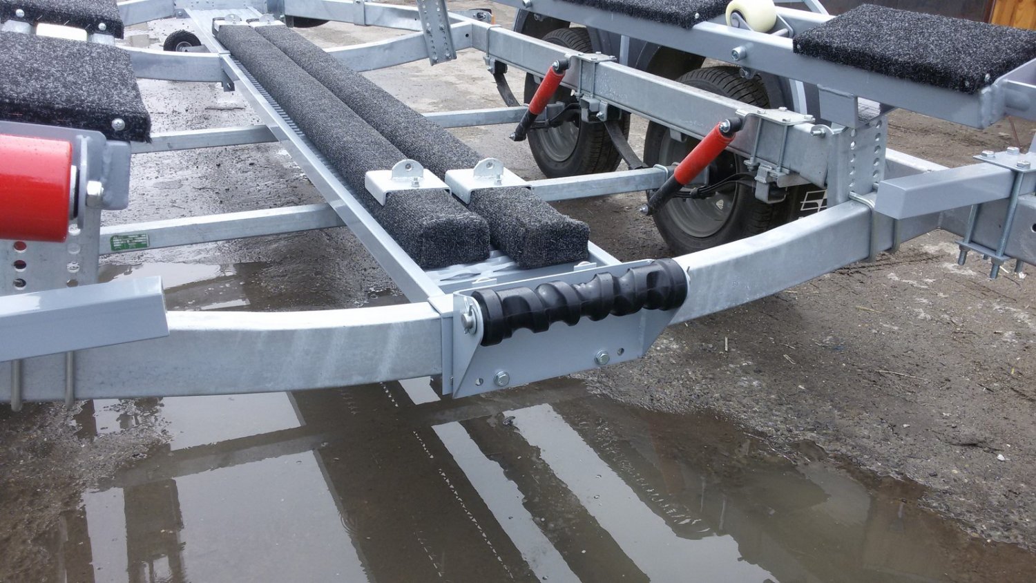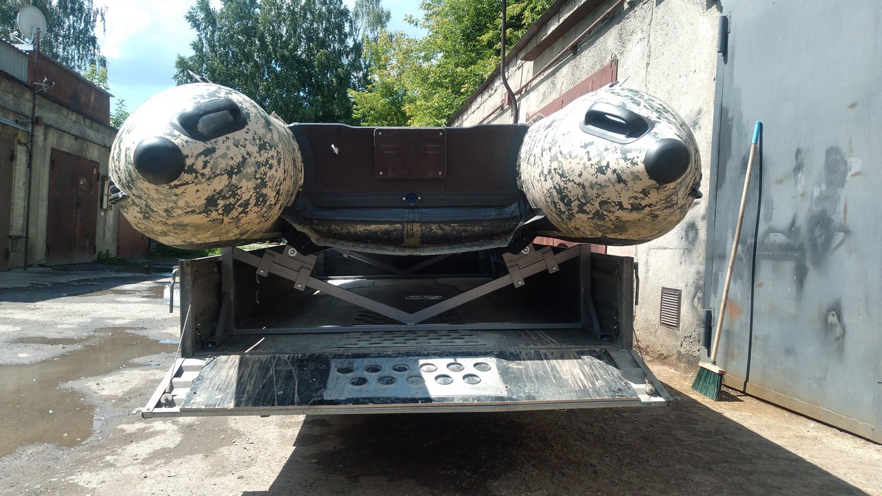 Носовой упор передвижной, с лебедкой, рассчитан под лодку ПВХ. Передвижной подрамник на рессорах с отбойниками, позволяет проводить центровку прицепа под конкретную развесовку лодки и мотора. Передвижные скобы крепления лодки. Ложементы деревянные под ковролином. Страховочные цепи.