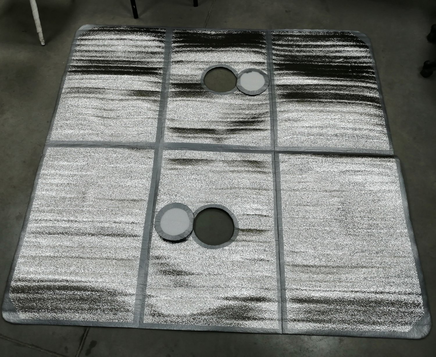 Всем привет! Сегодня закончил изготовление пола для своей новой палатки. За основу взял вспененый утеплитель 7мм и армированный сантехнический скотч. Занимался таким делом впервые, поэтому на работу потратил часов пять(удовольствие растянул на два дня). Размеры пола 2×2 метра. Самым хлопотным занятием было обклейка лунок, контуров и мест сгиба скотчем. По расходам: утеплитель-200р. (4м), скотч-250р. (25м), липучка-30р. (1м, затратил пару сантиметров), лента и застежка обошлась в районе 50р. Хотелось бы послушать ваше мнение по данному изделию, может посоветуете что-нибудь, может кому-то будет полезна моя информация. Благодарю за внимание!