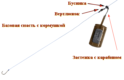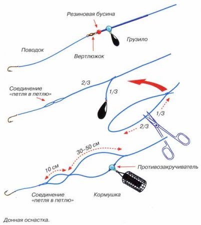 2. Для "картятников": использую в качестве основной только монофильную леску, диаметр 0,28 (иногда ставлю меньше, больше - редко). Оснастка - несимметричная петля (редко пользуюсь симметричной). Если нет течения - необходимость в тяжелых кормушках пропадает. Все остальное как указано выше.