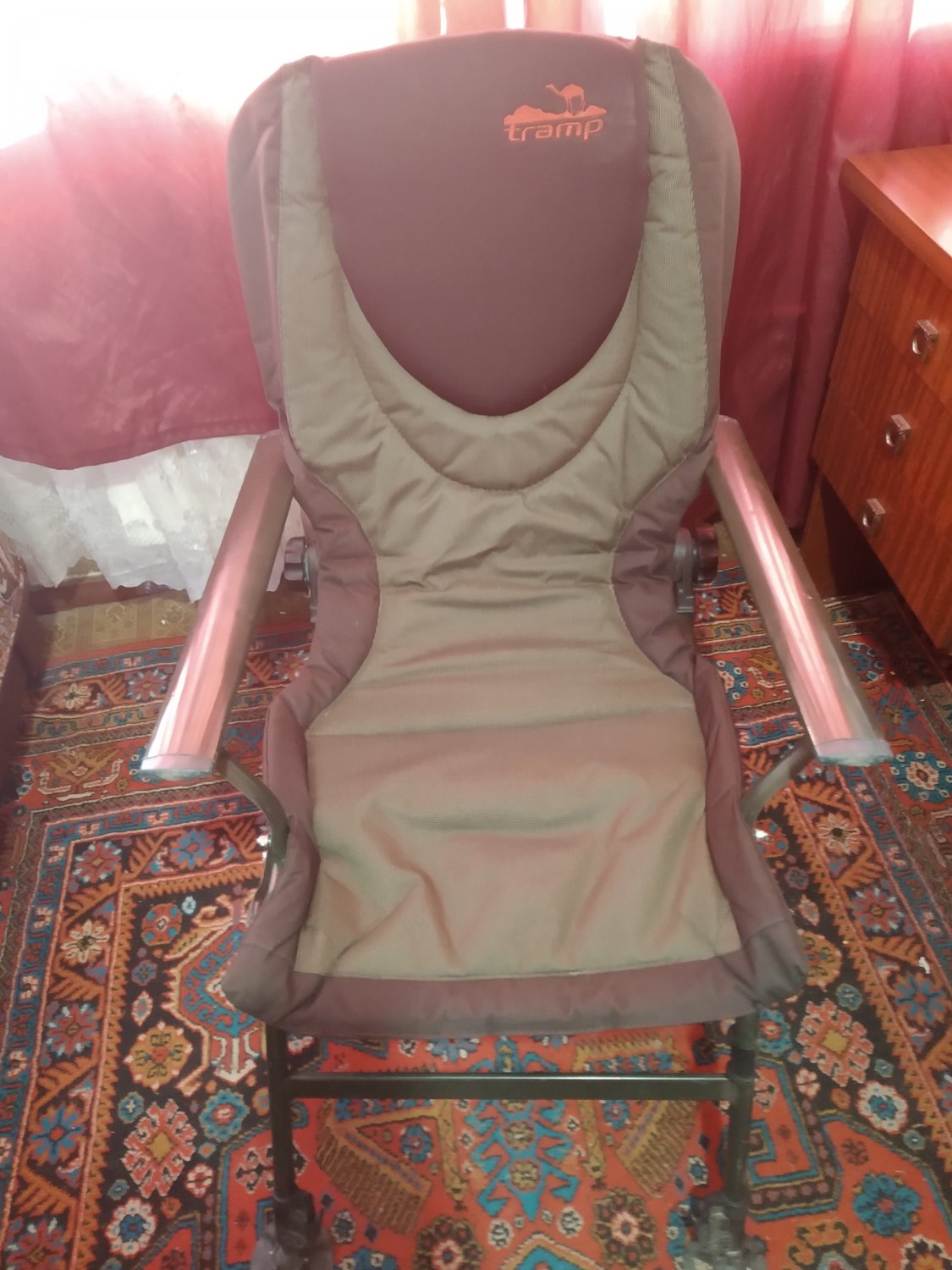 Обычное такое бывалое кресло с подлокотниками.Ноги телескопы. Ни разу не повело.все работает, все крутится. Ничего не шатается.