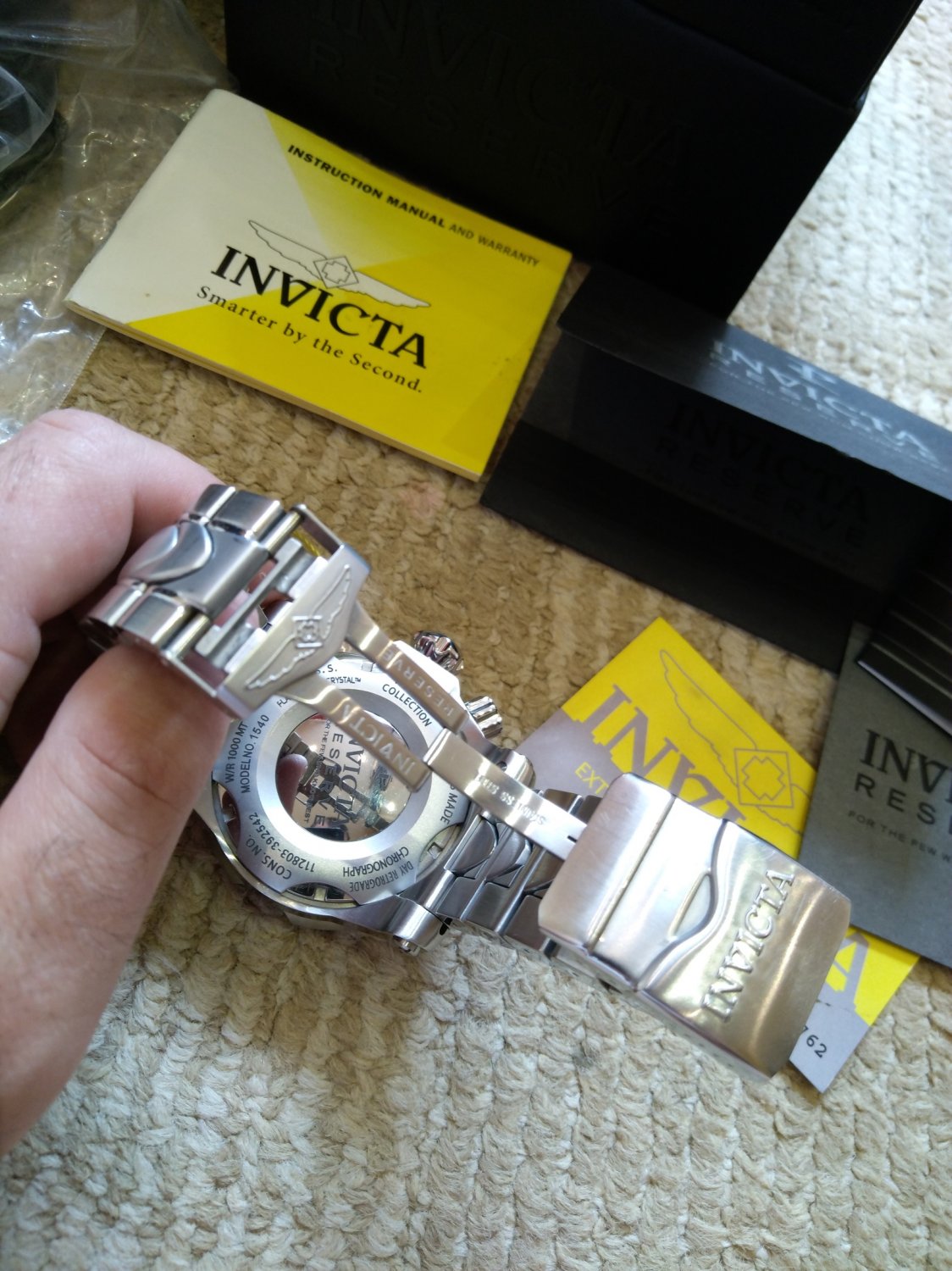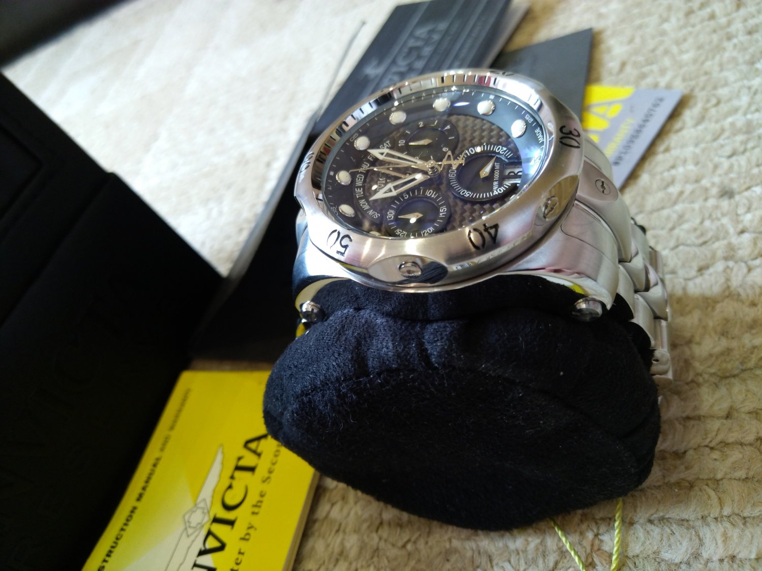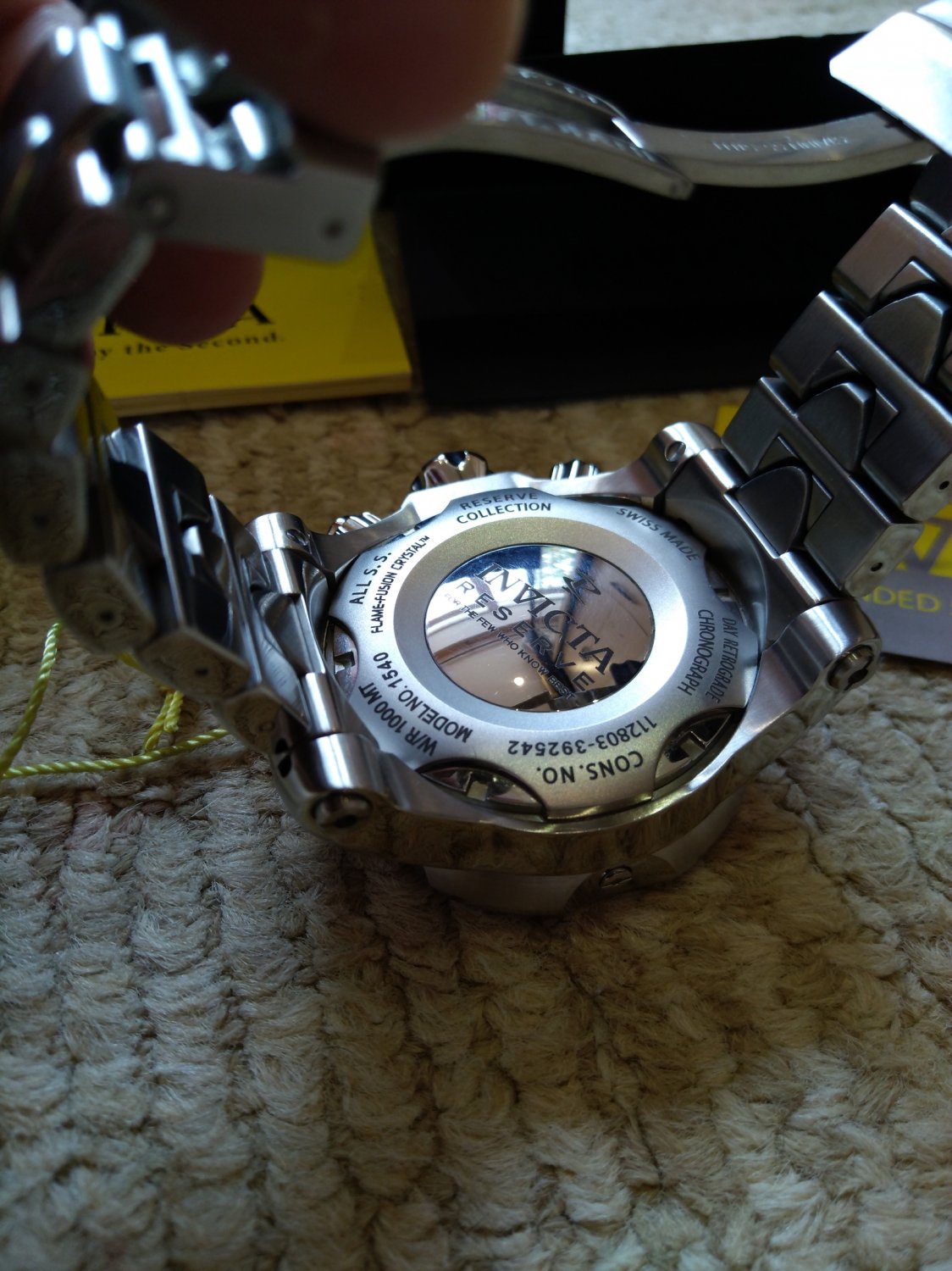 Часы огромного размера и высоты, очень тяжелые, подойдут либо обладателю очень крупного запястья, либо фанатам марки Инвикта. Часы в свое время приобретались в коллекцию, как самые большие и тяжелые из увиденных когда-либо. Водозащита, заявленная производителем 1000м. Стекло -Flame Fusion. Цвет цифера темно синий из карбона. Сложный составной браслет, всегда держит круглую форму.