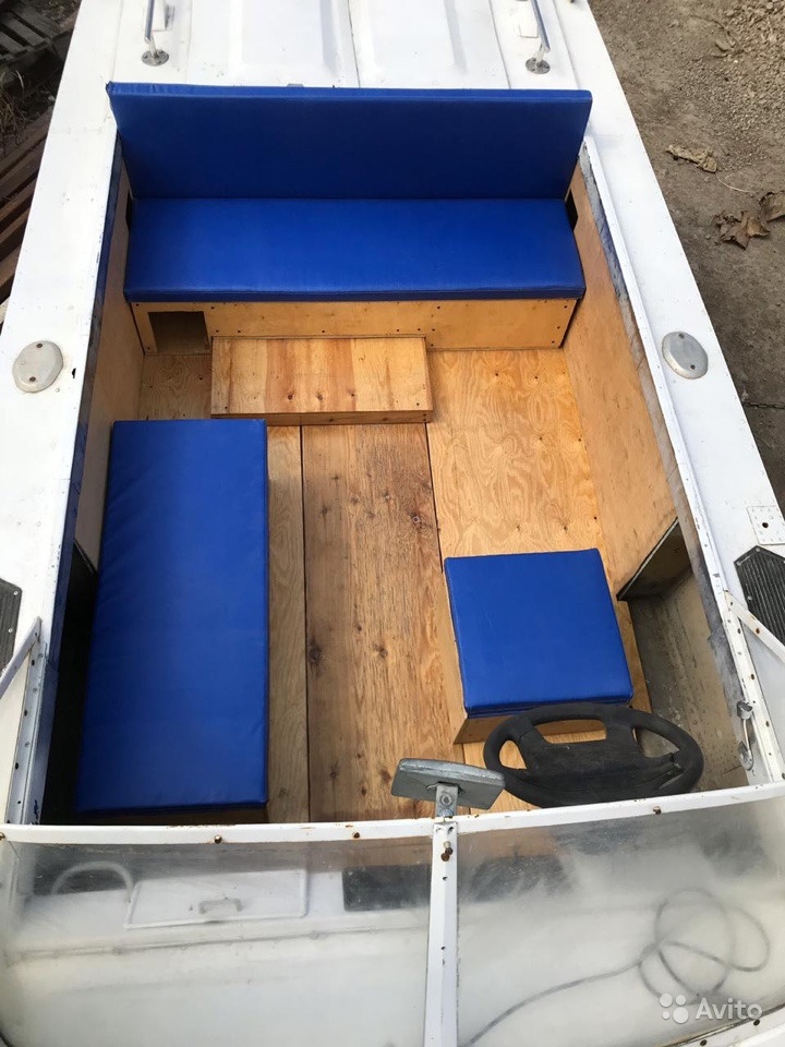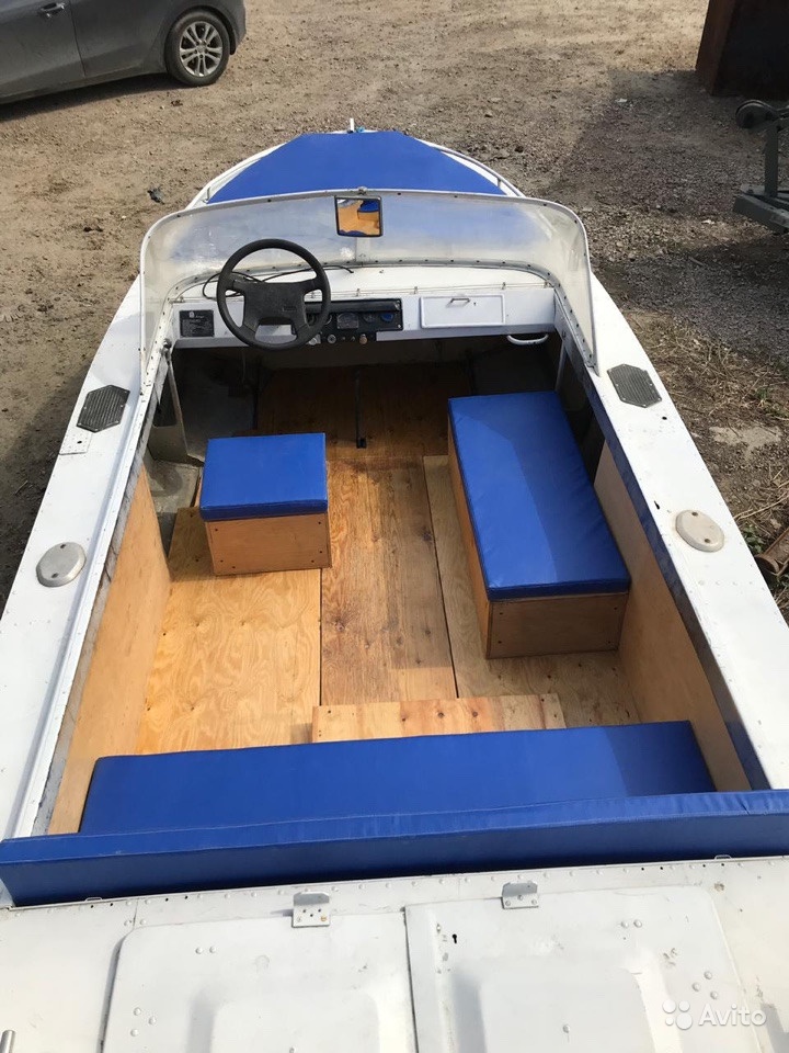 Старый салон был утилизирован. Поставили все новое. Из специальной влагостойкой фанеры был собран пол и на несколько слоёв покрыт яхтенным лаком. В катере ходили только в чистых тапочках. Сделаны бардачки и ниши под спасательный и рыболовный инвентарь. Сидушки были сшиты на заказ и к ним в комплект мягкий лежак на нос. Никаких дырок от сигарет. В катере не курили. Откидной столик для приятного времяпрепровождения.