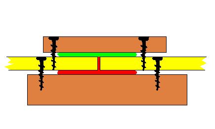 1.Для начала возьмите доску немного длинней соединительного шва, 15-20 см ширины, и от 1/2" до 1" толщины (коричневый цвет). Закройте доску листом полиэтиленовой плёнки, препятствующей эпоксидной смоле приклеиться к доске. Пропитайте полосу стеклоленты длиной с шов, эпоксидной смолой с небольшим количеством наполнителя, и кладите её (красный) на доску покрытую плёнкой.