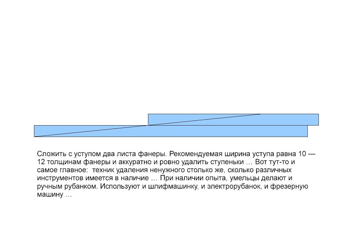 доброго дня всем у кого день или ночь! а можно подробнее про соединеиние листов фанеры. я ниче не понял толком. никогда этим не занамался. а на вашем форуме почитал и проникся идеей лодку сваять. для семейного отдыха к весне. вчера сребенком даже джекбот сделали из картона 1х10. прикольно получилось.