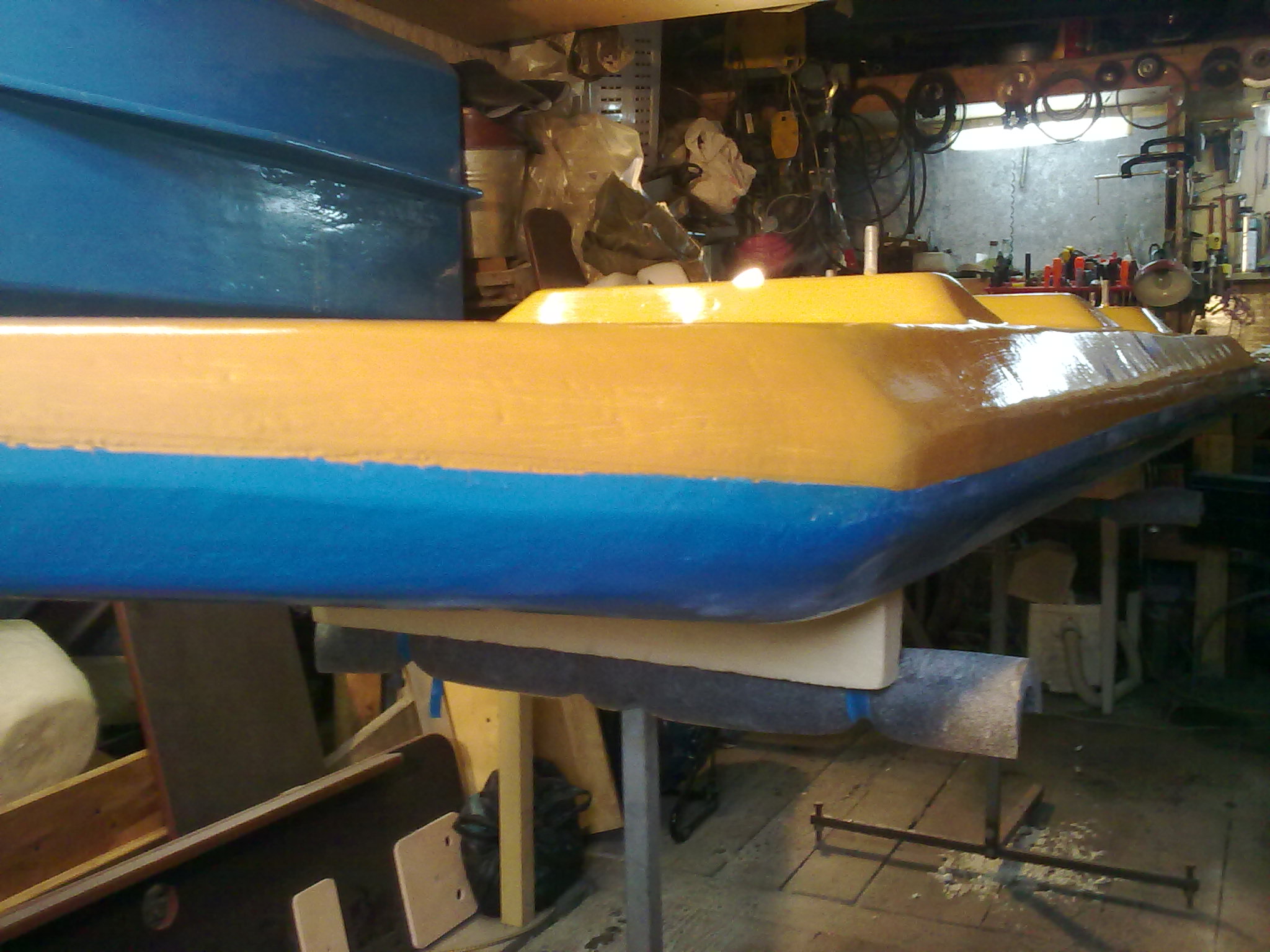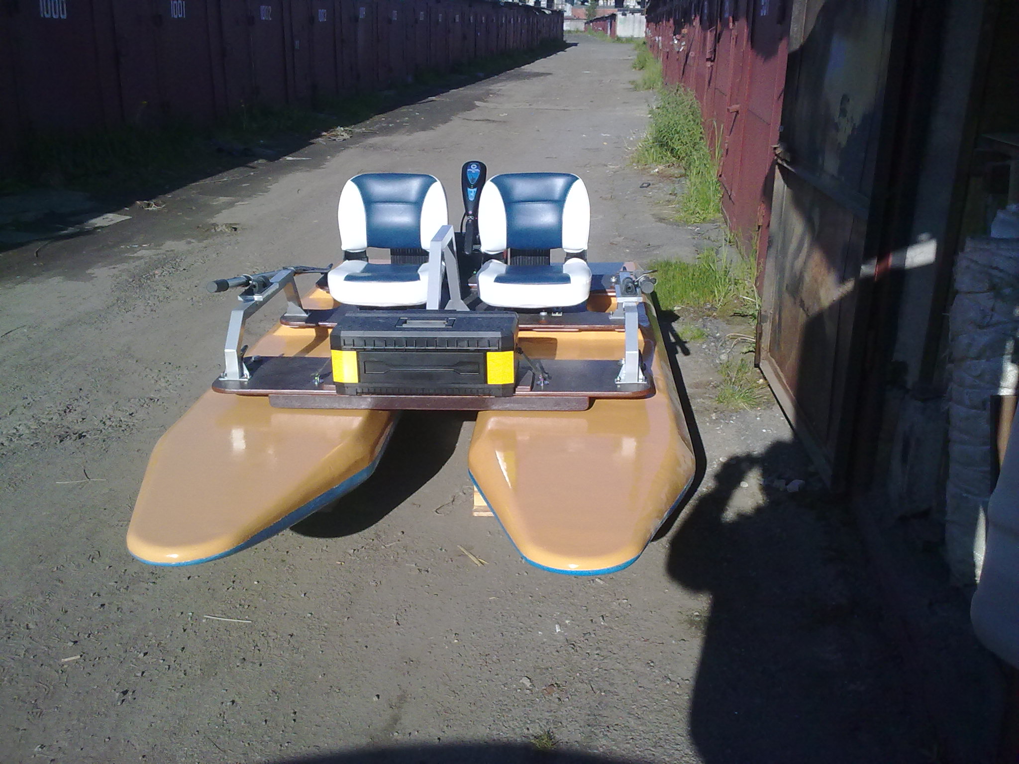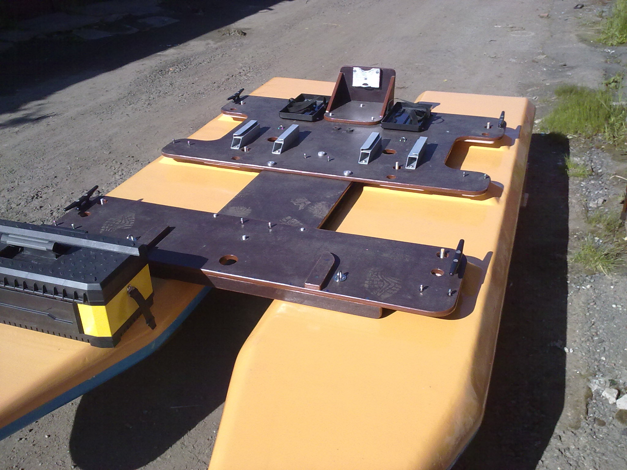 длинна3400ширина1700высота350с килем поплавок3400-700-200 без киля и опор палубы, изготовлен полистирол экструзионный хрs30-250 стеклопластик т13п-76 и эд-20 днище 3 слоя верх 2 опоры 4 слоя палуба 1435-1450мм фанера фсф-б2 толщина18 разборная из 3частей вес поплавка-36кг палуба-32кг общий вес-130кг без доп.оборудования обьем корпусов-0.740м.куб обьемное водоизмещение- 0.88м.куб полное -0.4064т осадка-225 грузоподьемность если по m=0.75v1000-m то получается-205кг все чертежи в голове делал экспромтом для мехобработки делал временные эскизы