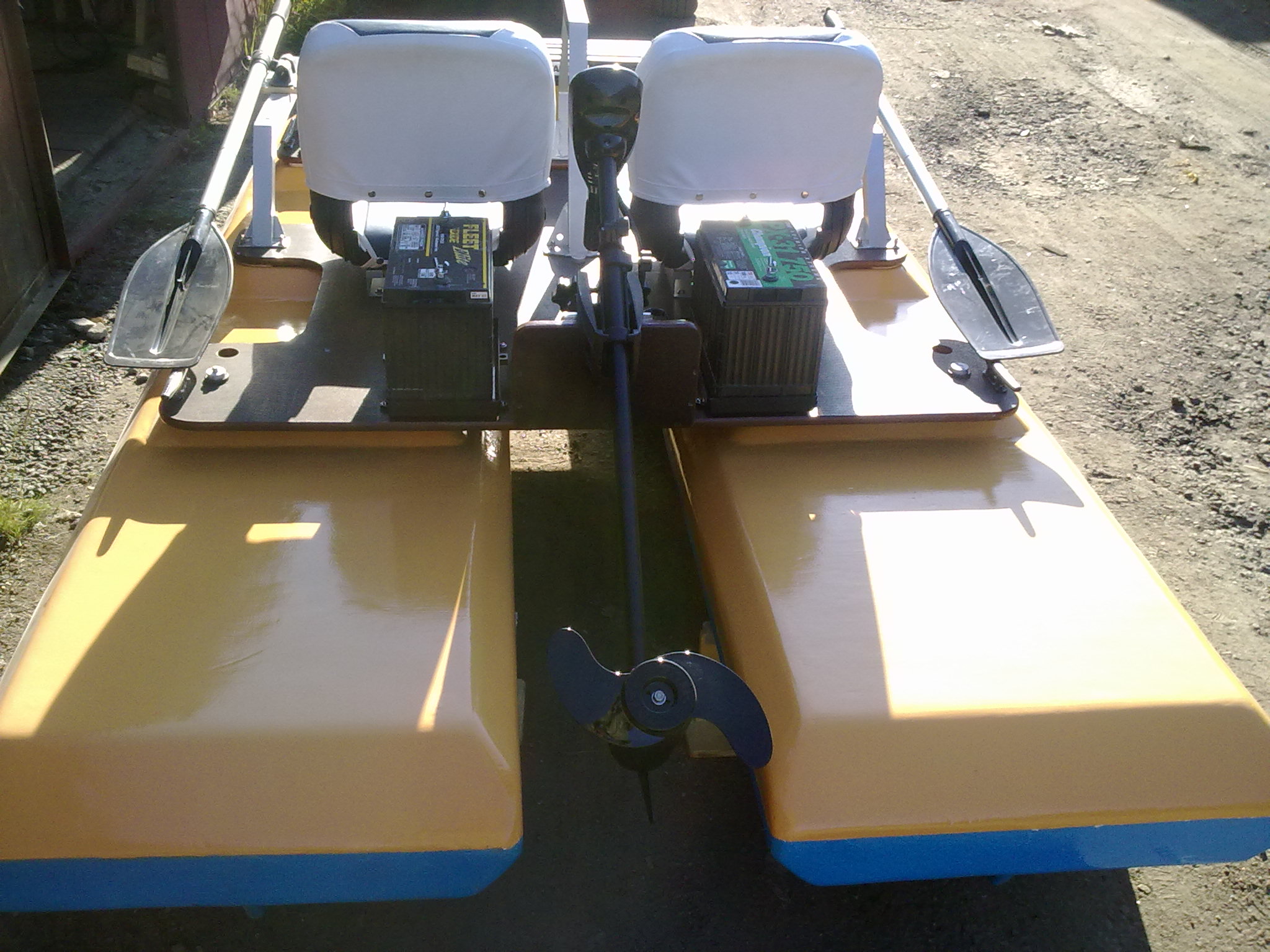 за зиму хочу немного доработать кат при ходе под мотором между балонами сжимается поток воды и поднимается выше основного уровня что очень ухудшает работу вот и хочу поставить наклонную плиту под транец чтобы сглаживать поток перед винтом и еще сместить мотор назад у меня палуба расщитана на смещение +- 100мм но и еще смещу новым транцем на 150мм -сезон все покажет хочу добиться максимум приближения к глиссированию при ямахе F4B при такой форме ката есть надежда все расчеты в теории и от практики далеки есть одна досада что сезон не целый год