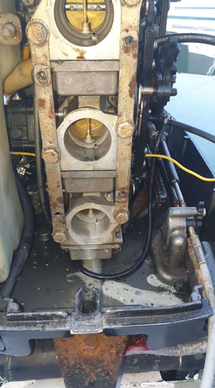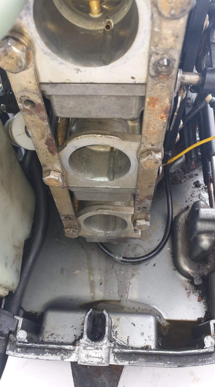 Здравствуйте, имеем мотор Mariner 50 лс с автомикс системой, примерно 1997 года. Заводится хорошо, но глохнет когда даешь больше газа, не тянет на всю мощность. Открыв крышку видно как из нижнего карбюратора течет темное масло и какая то серая пена. Это когда повернешь мотор га себя. Когда он в вертикальном положение, ничего не происходит. На берегу было все хорошо, ну так выглядело, а спустив в воду начались проблемы. Прикрепляю пару фото и надеюсь получится выложить видео.