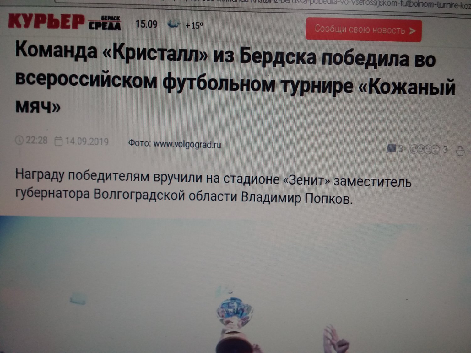 Бердская футбольная команда "Кристалл" в финальном матче победила и завоевала кубок всероссийского турнира "Кожаный мяч" в возрастной группе 14 - 15 лет. В турнире бились 72 команды. Бердчане - ЛУЧШИЕ!!!!